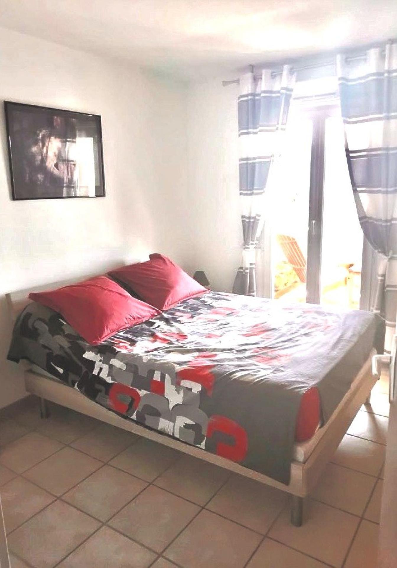 - Une chambre confortable avec un grand placard intégré, ouvrant directement sur la terrasse