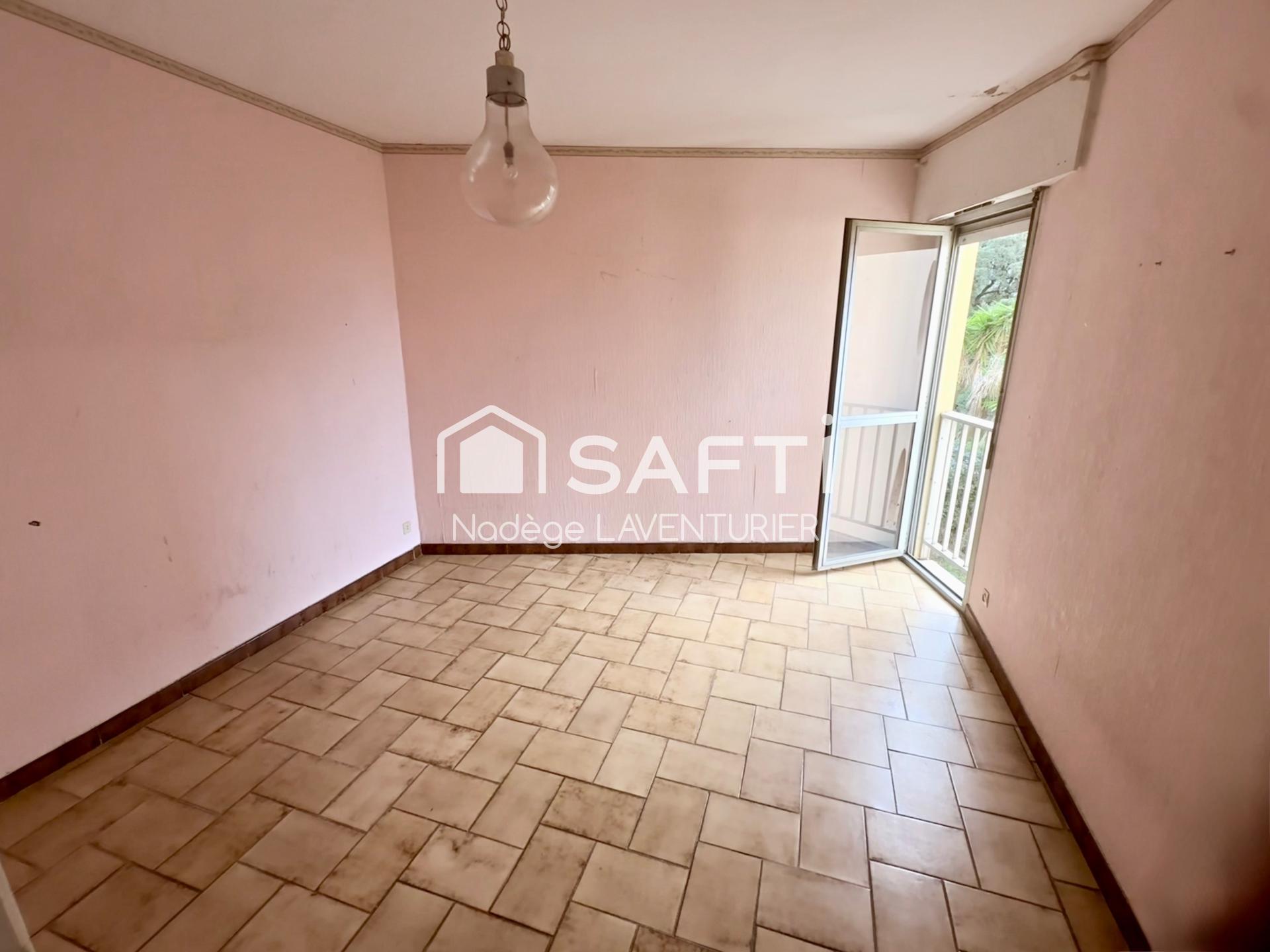 Terrasse vue mer, clim, rangements, parking collectif, résidence calme, fort potentiel après rafraîchissement.
