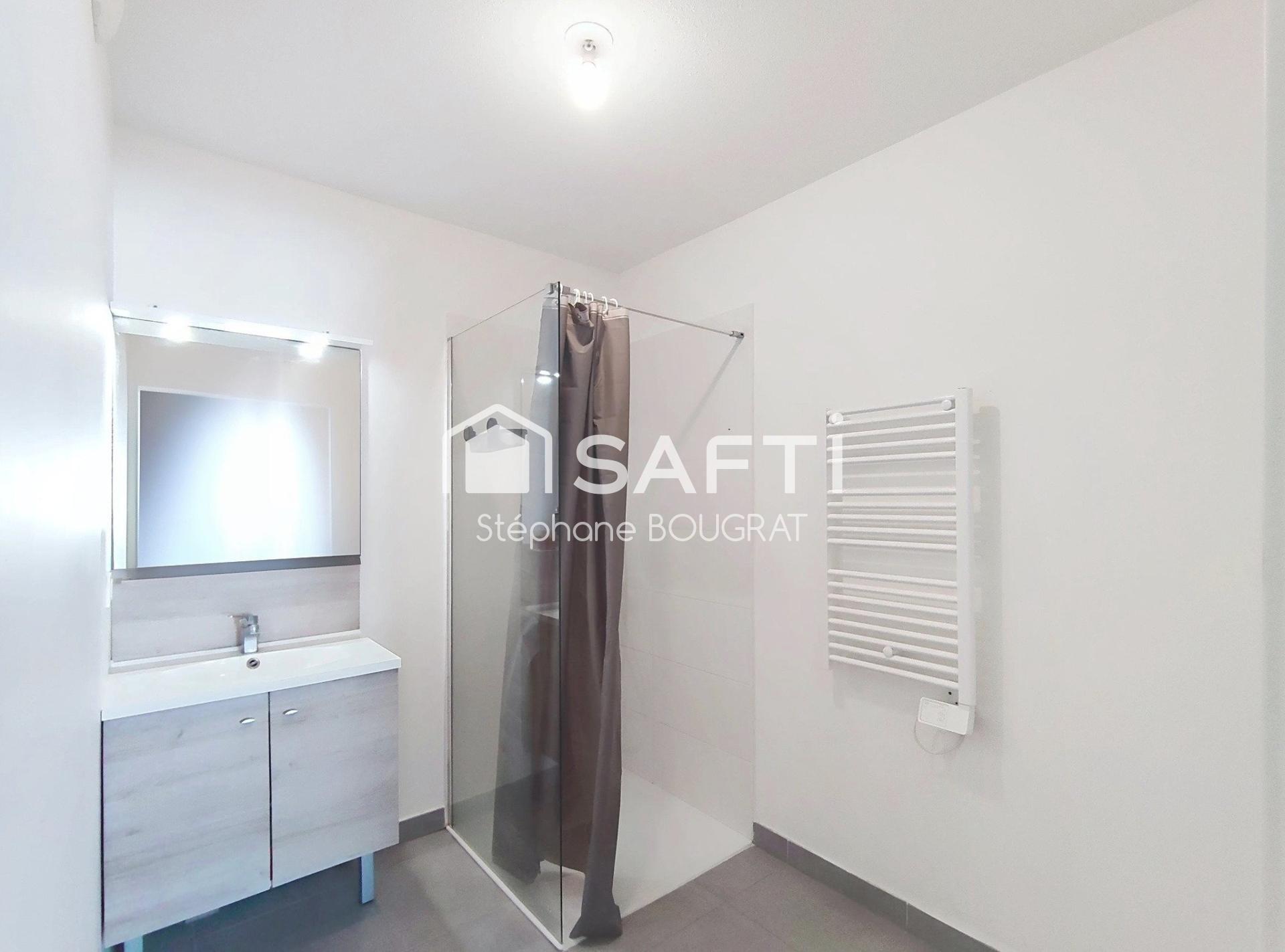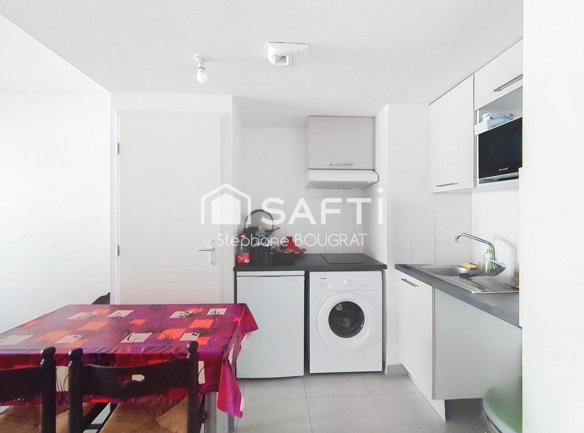 À l'intérieur, l'appartement se compose d'une entrée, d'un séjour lumineux avec cuisine équipée, d'une chambre avec salle d'eau attenante et WC. Un balcon de près de 7 m² offre un espace de vie supplémentaire.