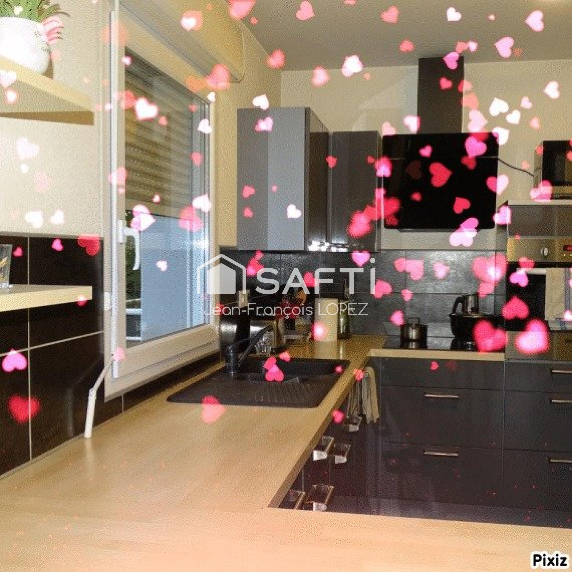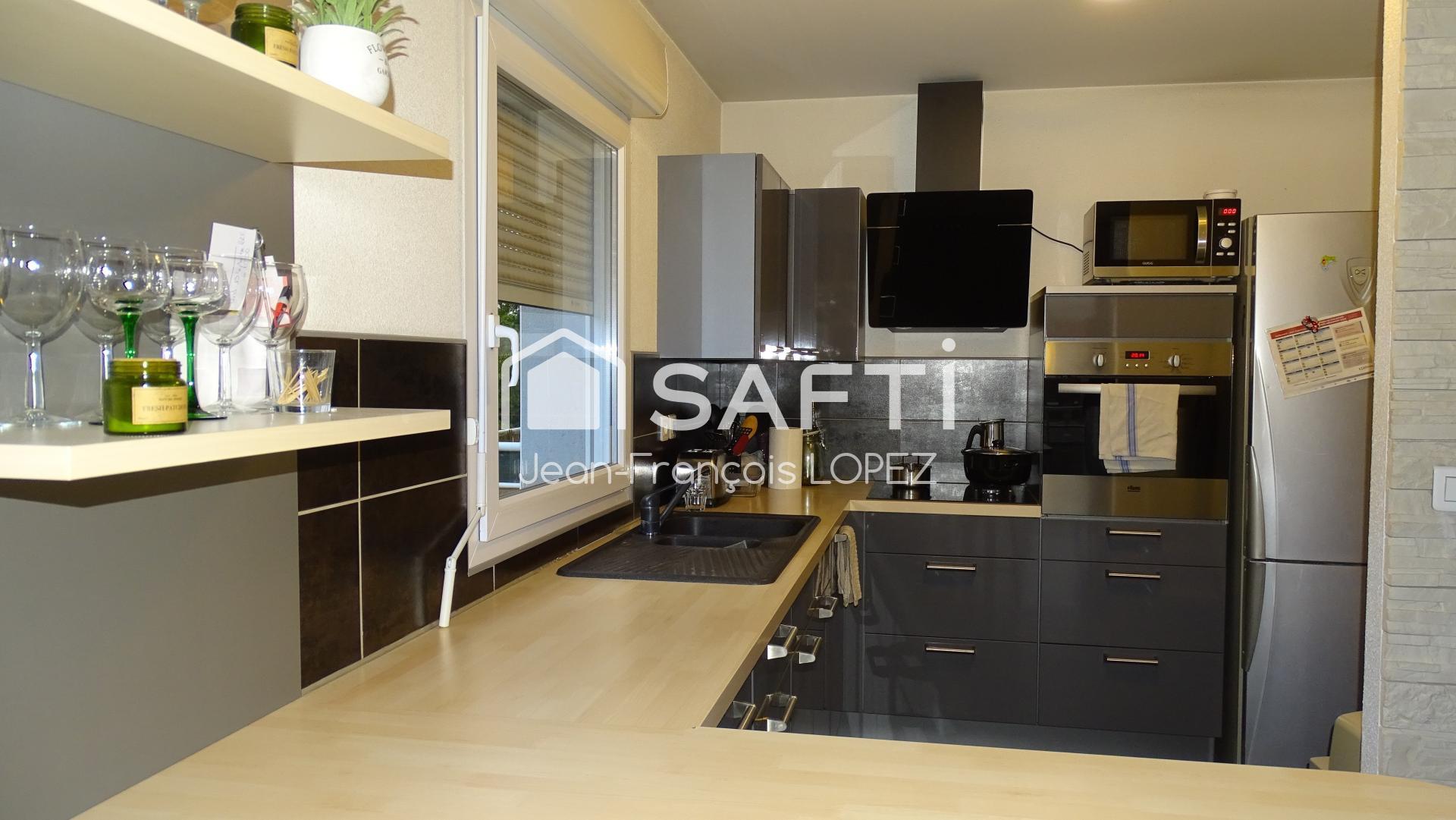 La cuisine équipée ouverte, sur une grande pièce de vie avec balcon,