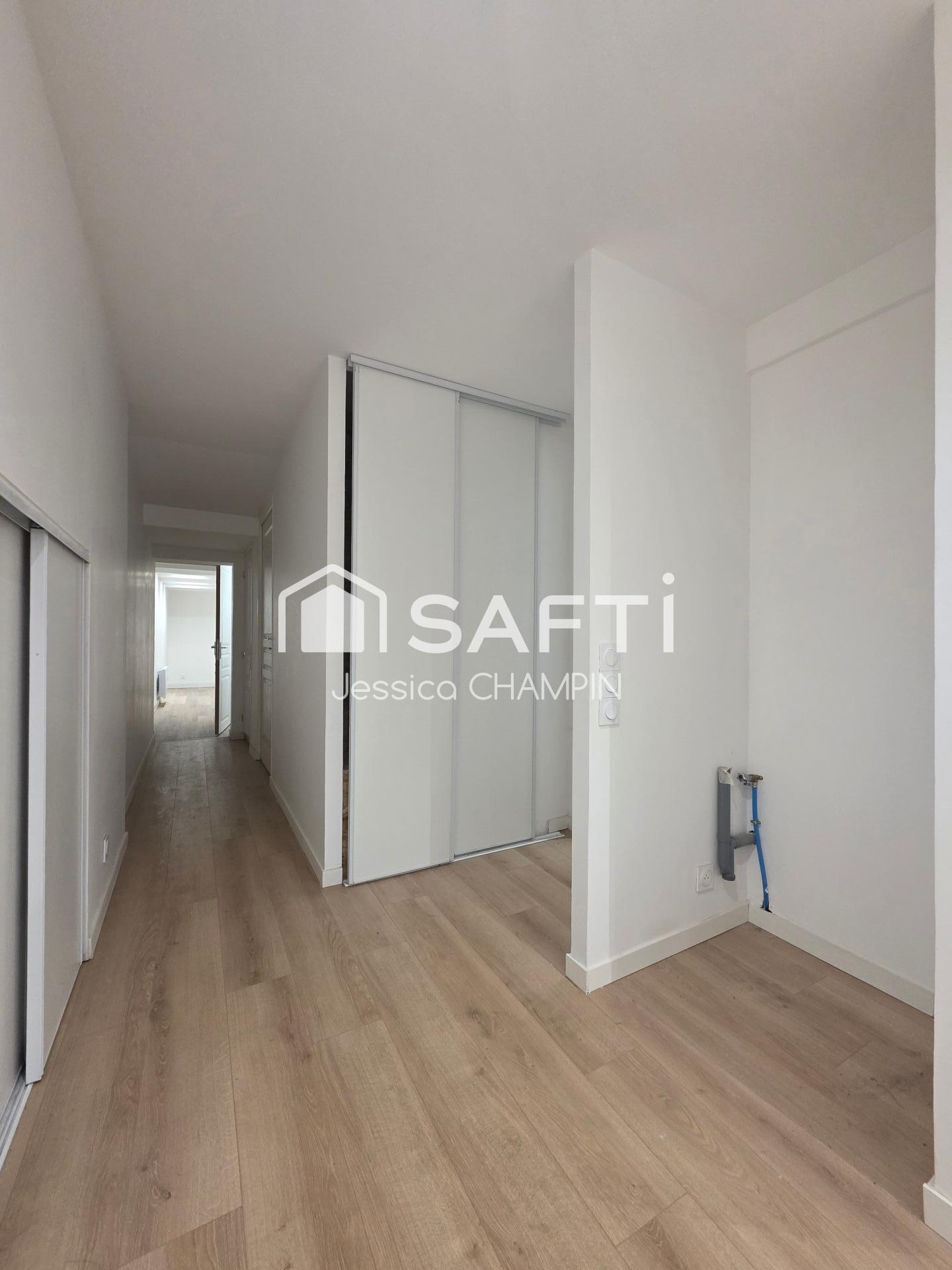 À l'intérieur, le séjour et la cuisine s'étendent sur près de 30 m², créant un espace de vie convivial et chaleureux. Les deux chambres, mesurant respectivement 9,55 m² et 9,9 m², sont baignées de lumière naturelle, offrant un cadre de vie agréable. La salle d'eau, bien agencée, est équipée d'une cabine de douche, d'une vasque et d'un radiateur sèche-serviettes. Un dégagement de 4,6 m² avec rangements optimise l'espace disponible, ajoutant une touche de praticité à cet ensemble harmonieux.