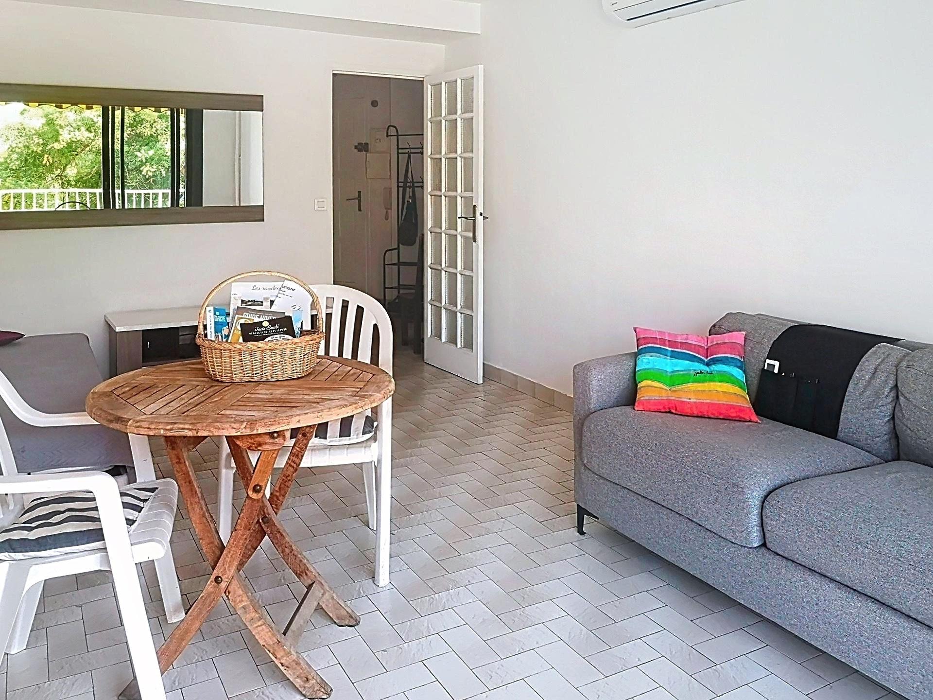 Orienté plein sud, le salon et la chambre donnent sur une longue terrasse filante sans vis à vis. Double vitrage et climatisation.