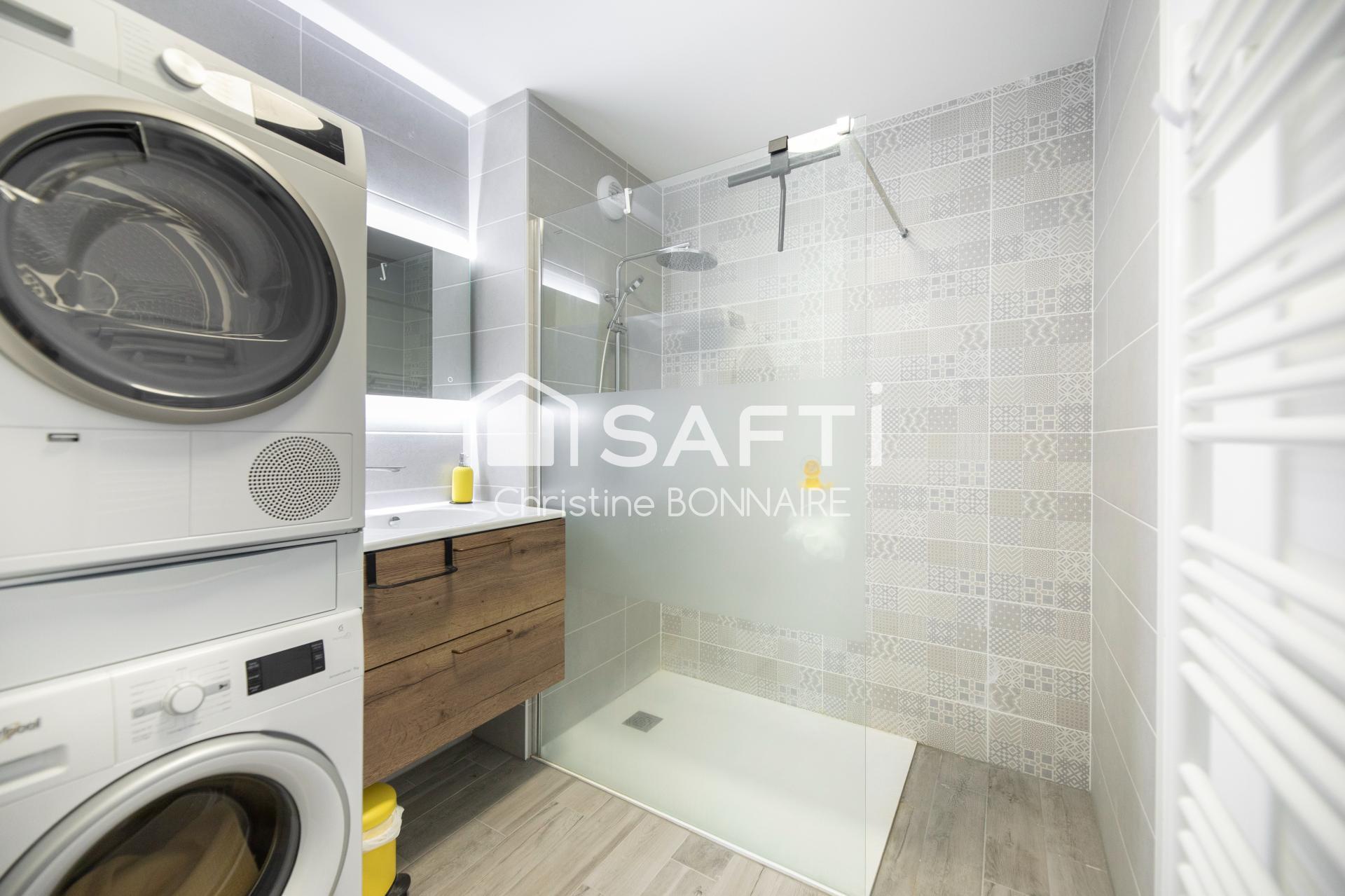 À l'intérieur, vous découvrirez une cuisine réalisés par un cuisiniste renommé, un aménagement pensé dans chaque pièce (salle d'eau, WC), des équipements électroménagers garantis jusqu'en 2028, ainsi que des finitions modernes. La pièce de vie ainsi que la chambre proposent des rangements sur mesure.