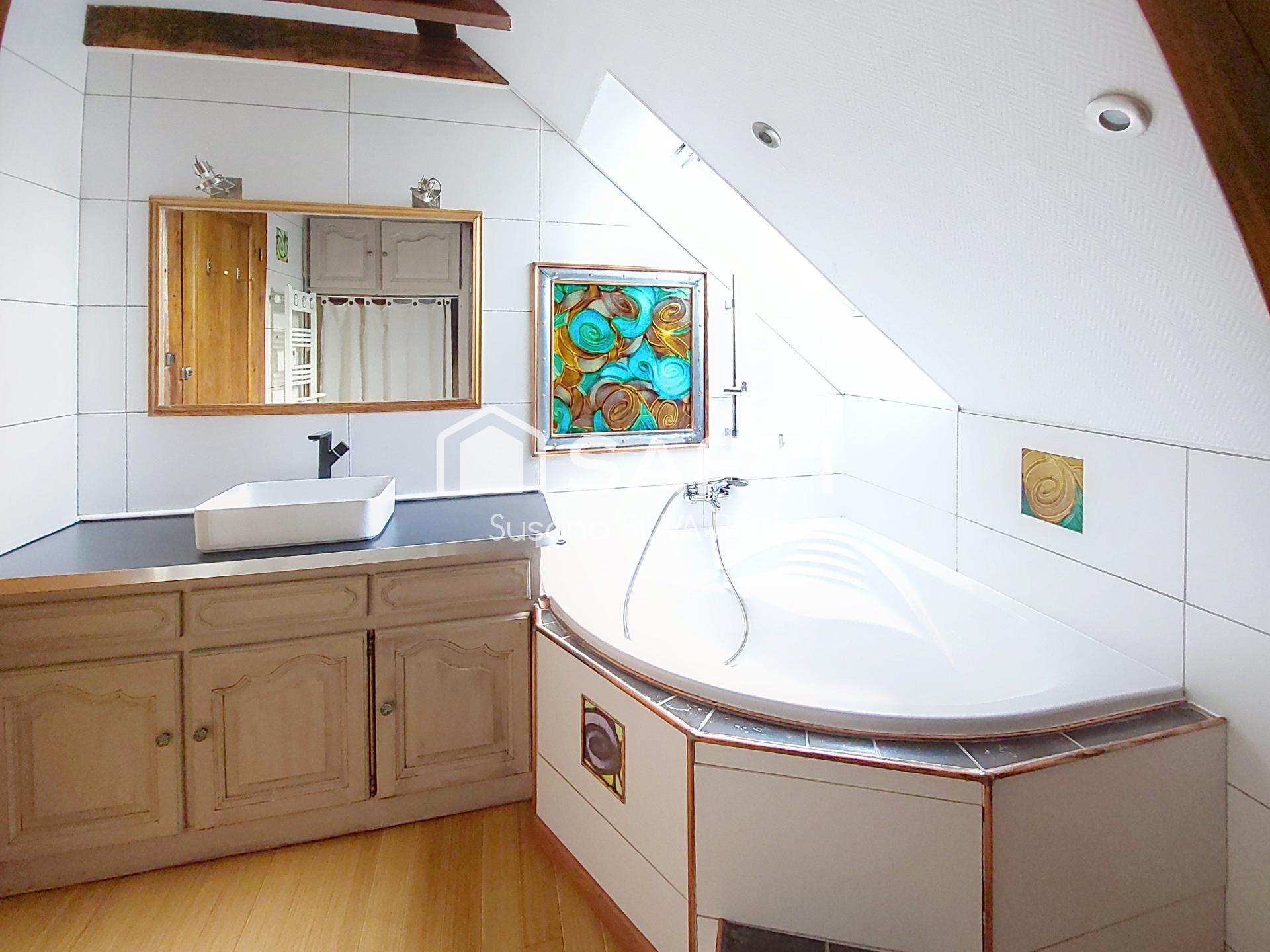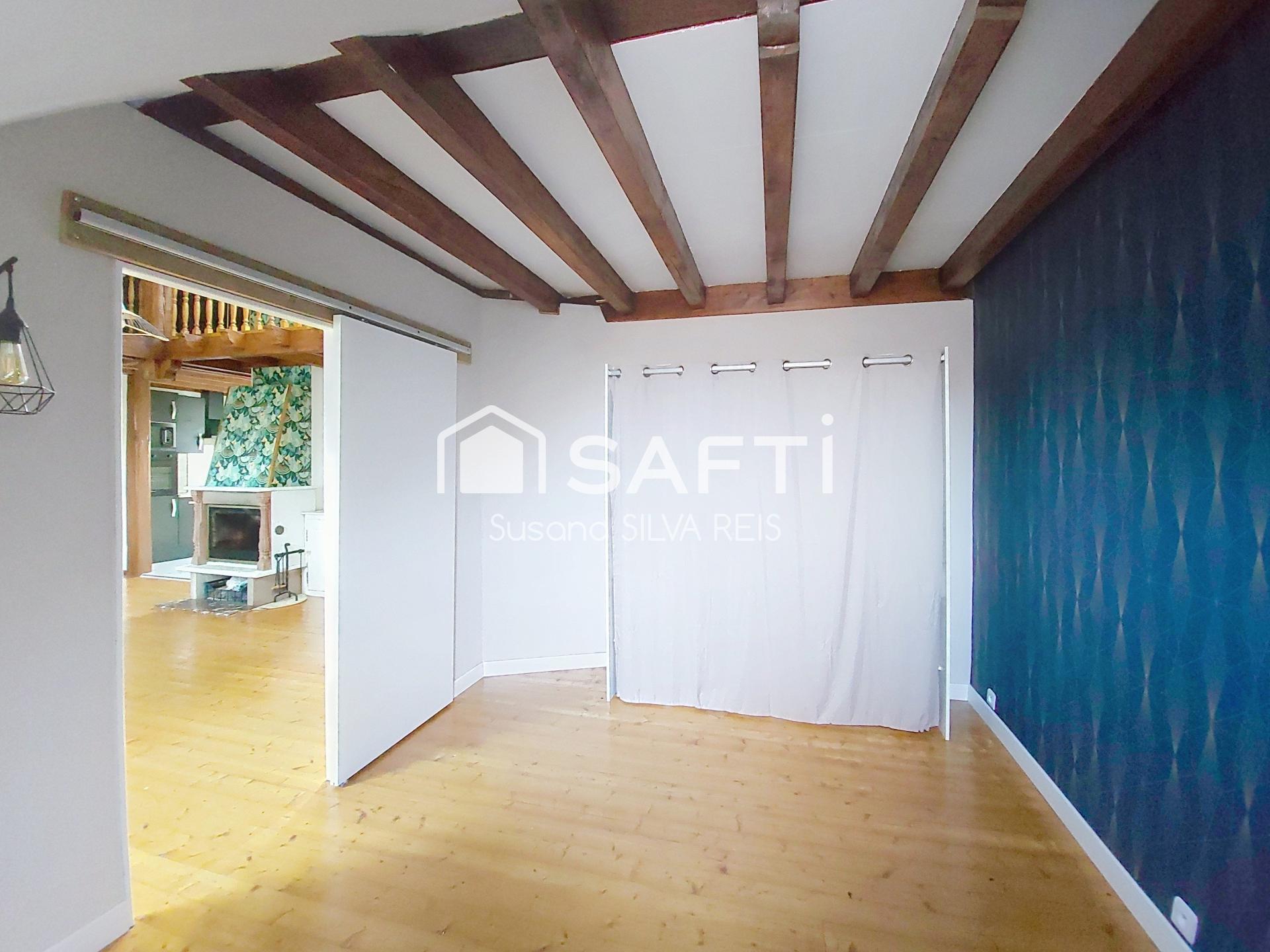 Le charme de l’ancien a été parfaitement conservé avec un parquet d’origine remarquable et de magnifiques poutres apparentes, apportant caractère et authenticité à l’ensemble.