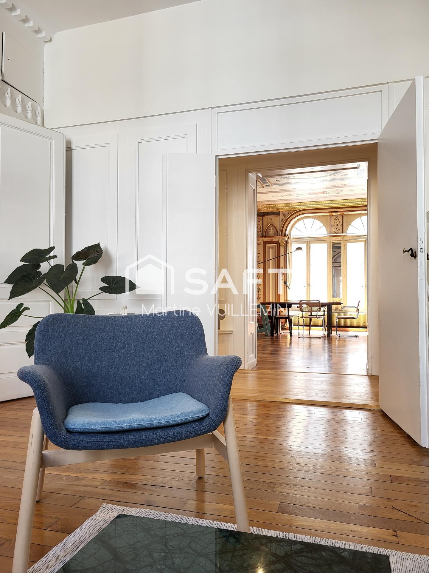 Ce T5 traversant offre 1 entrée, 1 vestibule donnant sur un salon, un grand séjour en décor peint de 30 m², complété par un plancher à chevrons et d'une cheminée en marbre bleu turquin et celle de la grande chambre en marbre rose de sampans, un salon de 19 m², une cuisine équipée, 3 chambres spacieuses, 2 salle de bains, 2 WC..