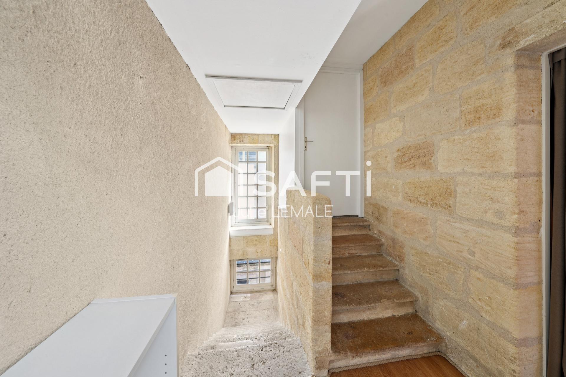 Idéalement situé à 3 minutes à pied du tram Hôtel de Ville, à 1 minute de la place Pey-Berland et à seulement 5 minutes de l’École de la Magistrature, ce bel appartement de 47.8 m² au sol se trouve au troisième et dernier étage d’un immeuble en pierre de petite copropriété.