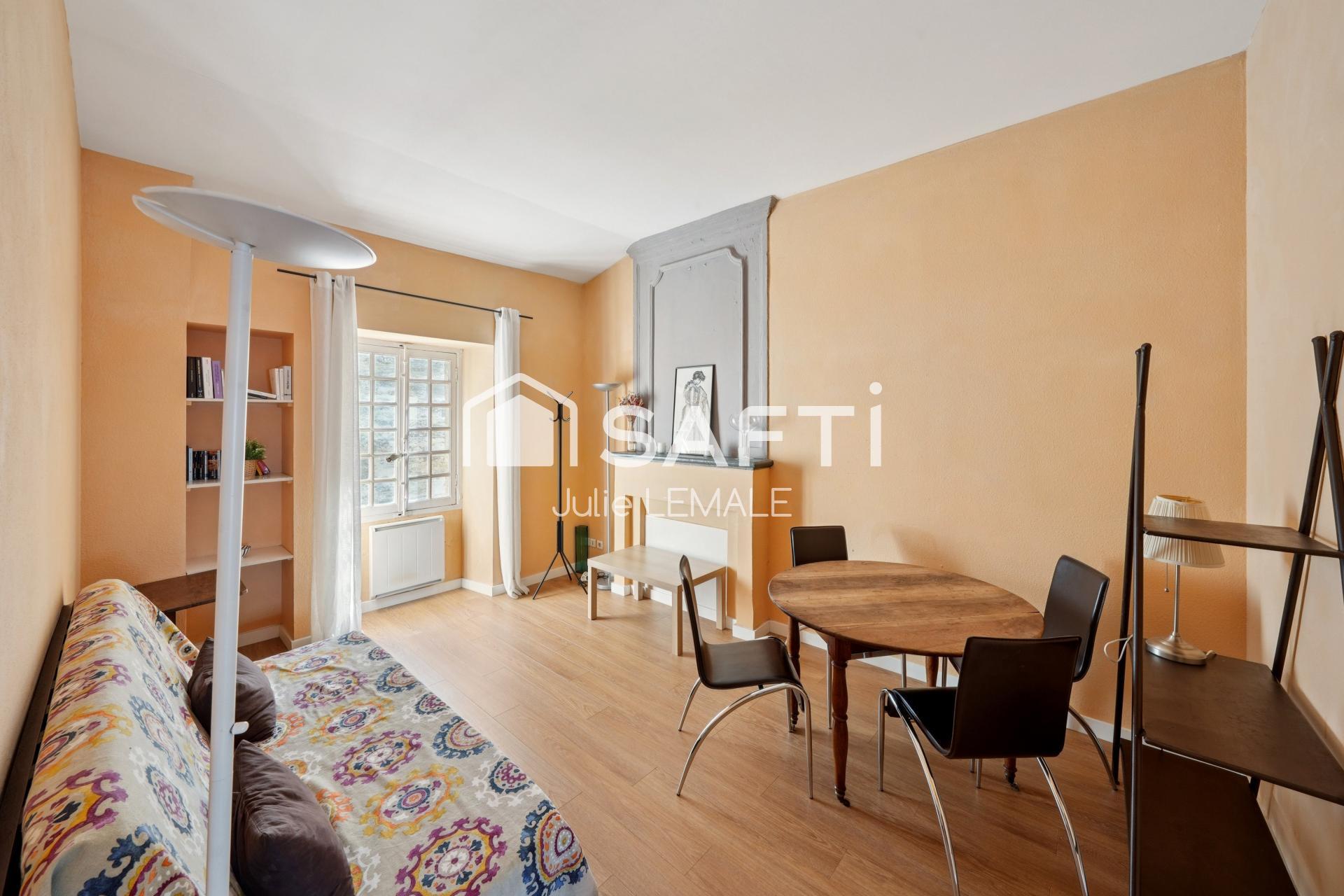 Il se compose d’une entrée avec marches, d’une cuisine indépendante, d’un séjour d’environ 15 m² avec 3 mètres de hauteur sous plafond, d’une chambre avec rangements et de sa salle de bains attenante, ainsi que d’un WC séparé.
