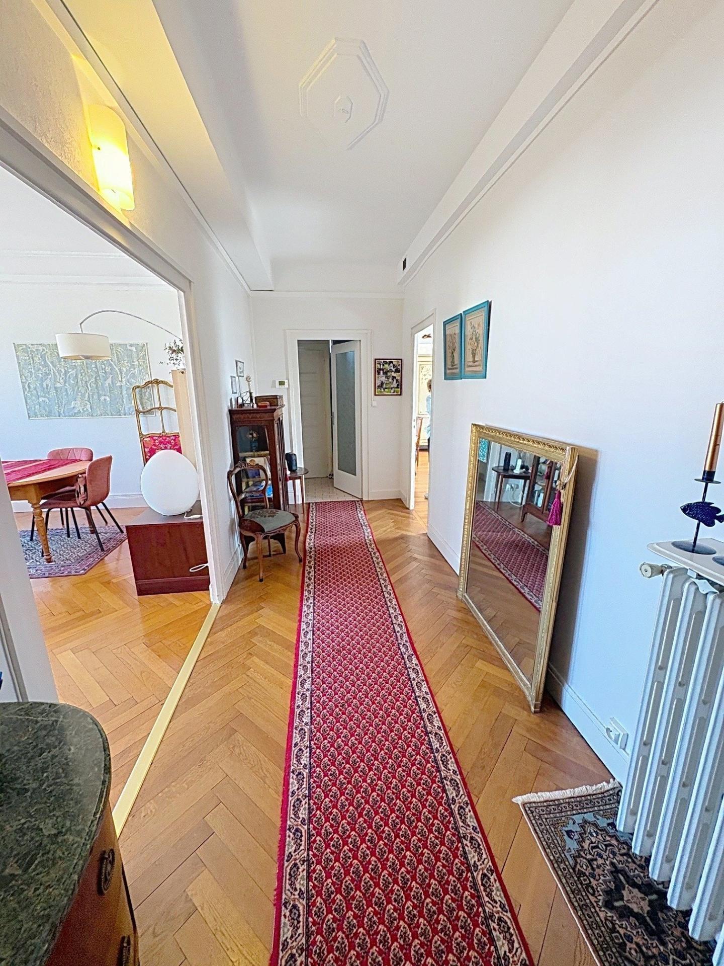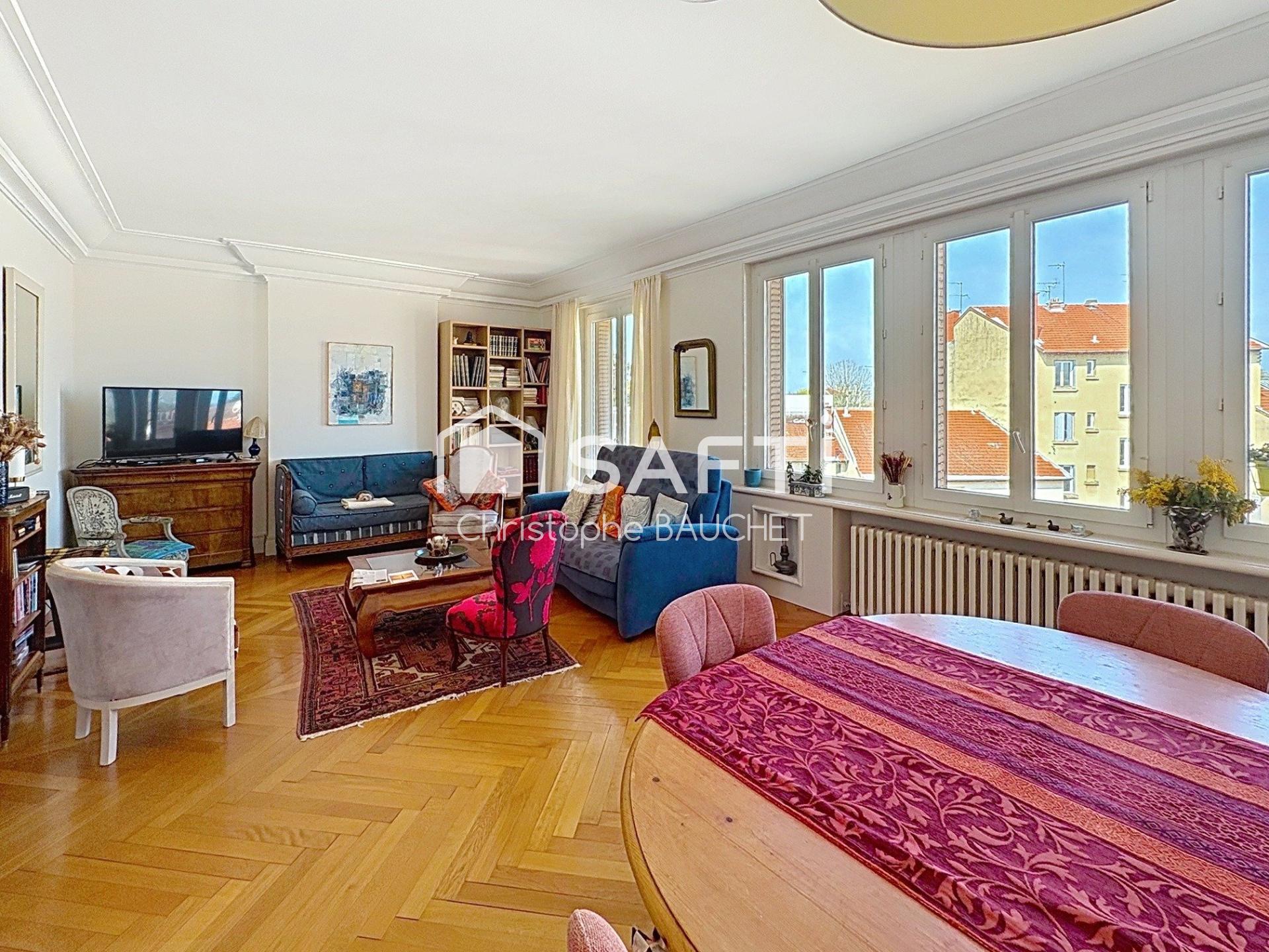 À l'intérieur, ce bien situé au 4ème étage impressionne par ses 107 m² bien agencés. Les volumes, le bel ancien et la lumiére s'entrecroisent. La disposition en 4 pièces comprend un hall d'entrée, un vaste séjour-salon, une cuisine aménagée, trois chambres, des placards, un WC, une salle de douche moderne et un dégagement pratique. Cet appartement offre un espace de vie confortable, complété par un grenier (ancienne chambre de service).
