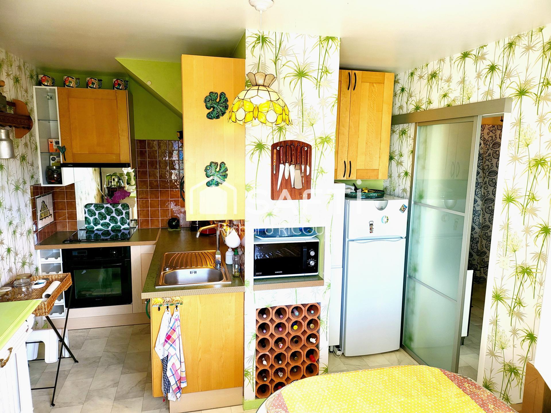 Le salon/salle à manger dessert à gauche un cabinet d'aisance avec un adorable lave-main. Puis à droite toute, l'escalier en bois (qui craque doucement :)) et dans la continuité, l'accès à l'espace cuisine et pour finir à la terrasse exposée Sud/Ouest. Et très pratique, la cuisine ouvre sa fenêtre sur la terrasse; Très pratique pour passer les plats...La cuisine aménagée possède son coin repas et on s'y sent bien. C'est pas riquiqui.
