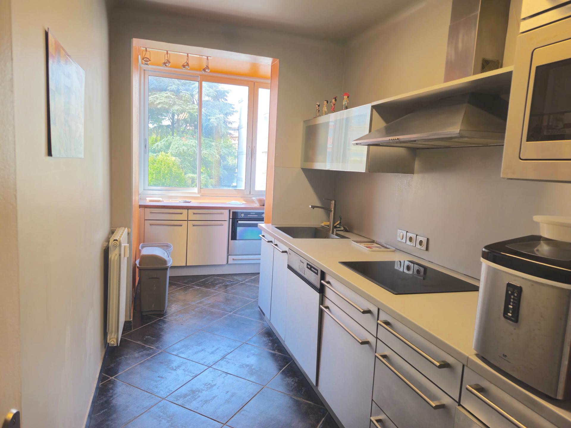 Cuisine équipée et sa loggia, salon climatisé, balcon pour les apéritifs. deux chambres avec rangement.