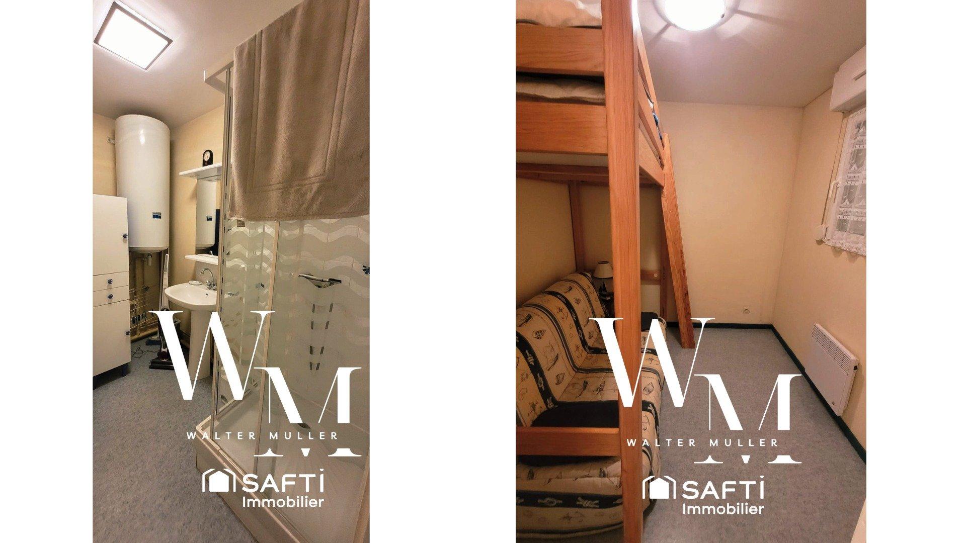 Situé au 1er étage, ce studio-cabine est facile d'accès et comporte une salle de bains avec WC, une cabine avec fenêtre et un espace de vie avec cuisine ouverte , qui bénéficie d'un bel ensoleillement grâce a sa baie vitrée. Le bien est accompagné d'une place de parking privative, très pratique pour les jours d'été.