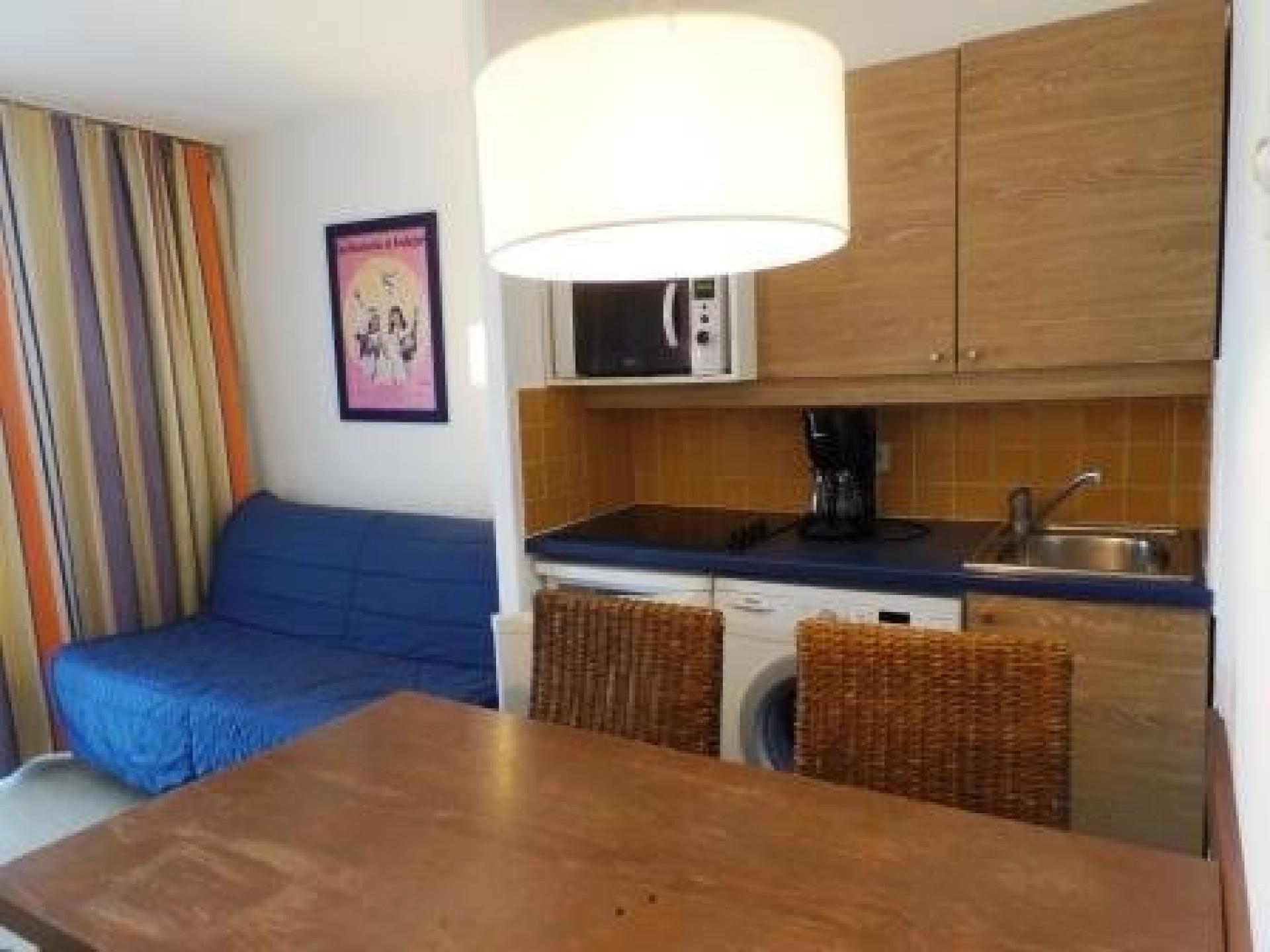 Il se compose d’un salon avec cuisine ouverte, d’une chambre cabine, d’une salle de bains et de toilettes séparés. Une terrasse complète ce bien.