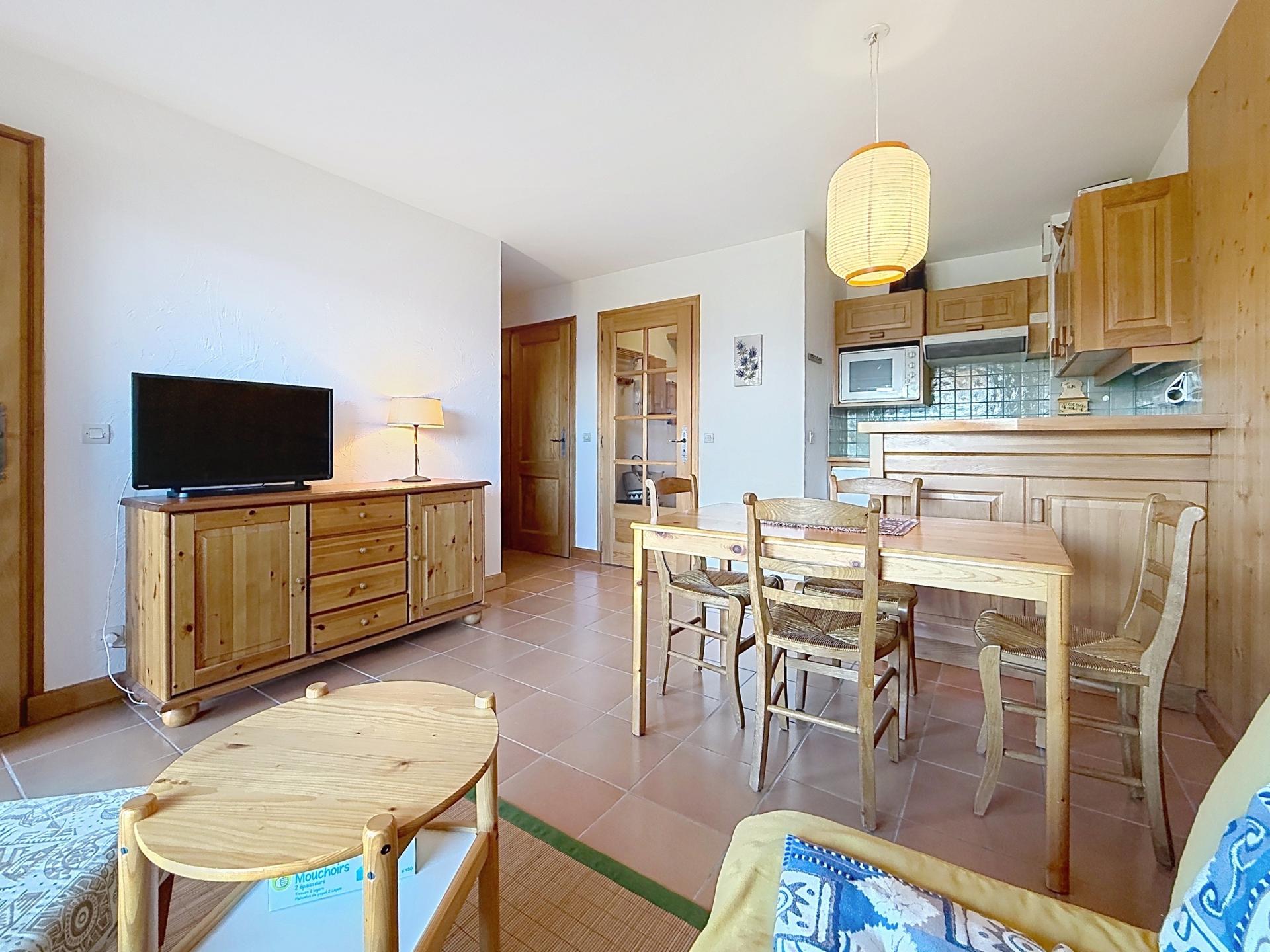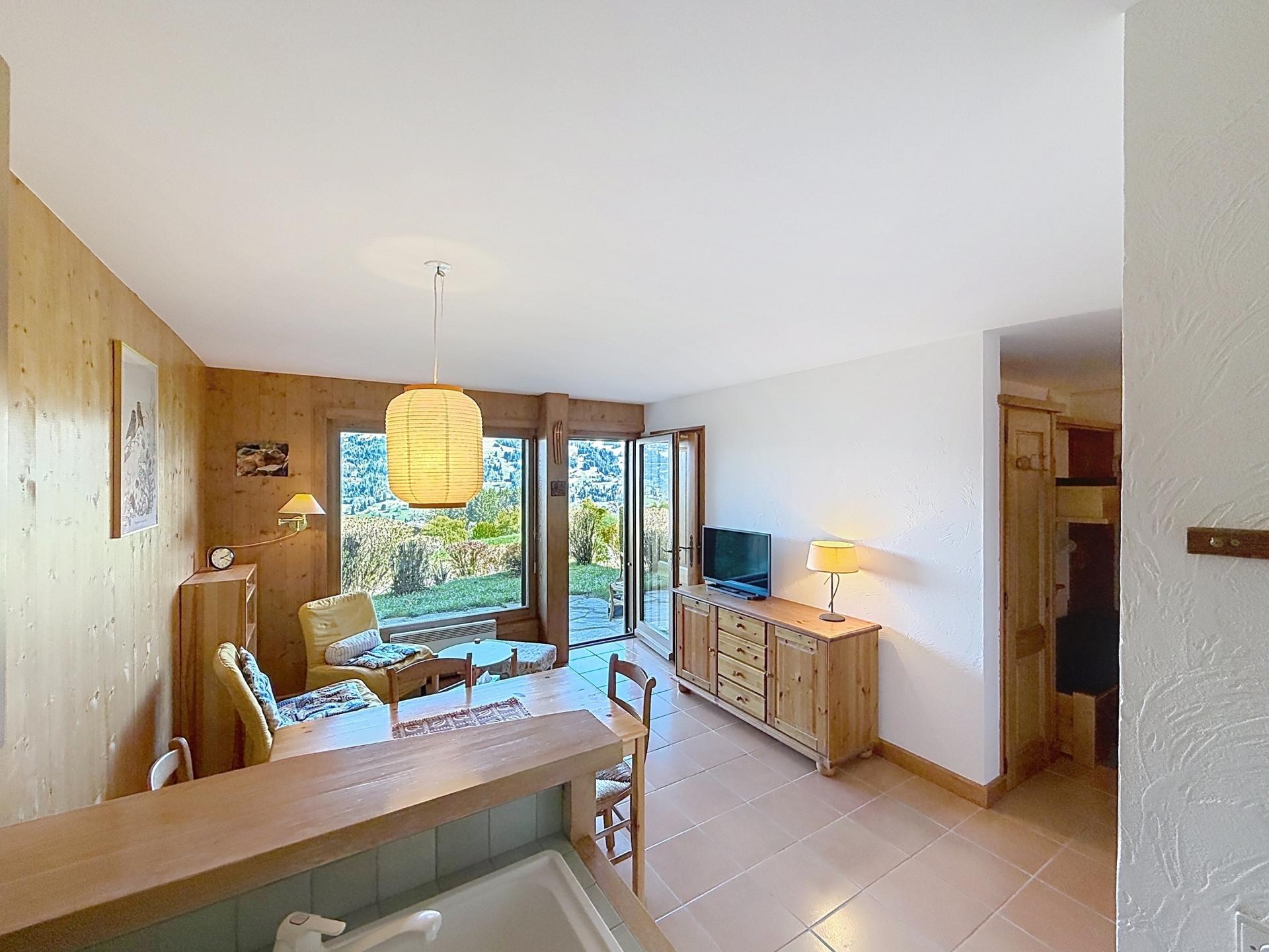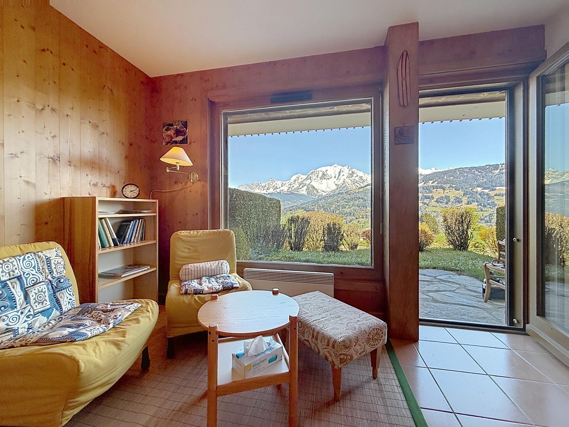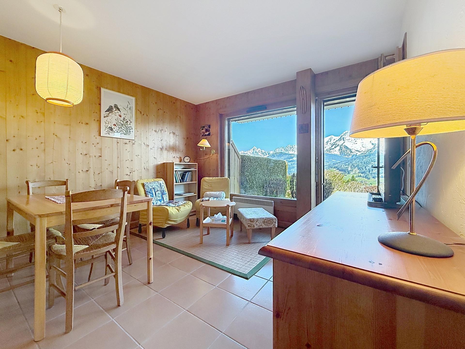À l'intérieur, ce bien propose une entrée avec placard, un coin nuit , une salle d'eau, un WC séparé, une cuisine ouverte sur le salon/séjour lumineux et une chambre avec vue sur le Mont-Blanc. Vous pourrez apprécier le confort et la praticité de ce rez-de-jardin, alliant modernité et charme alpin.