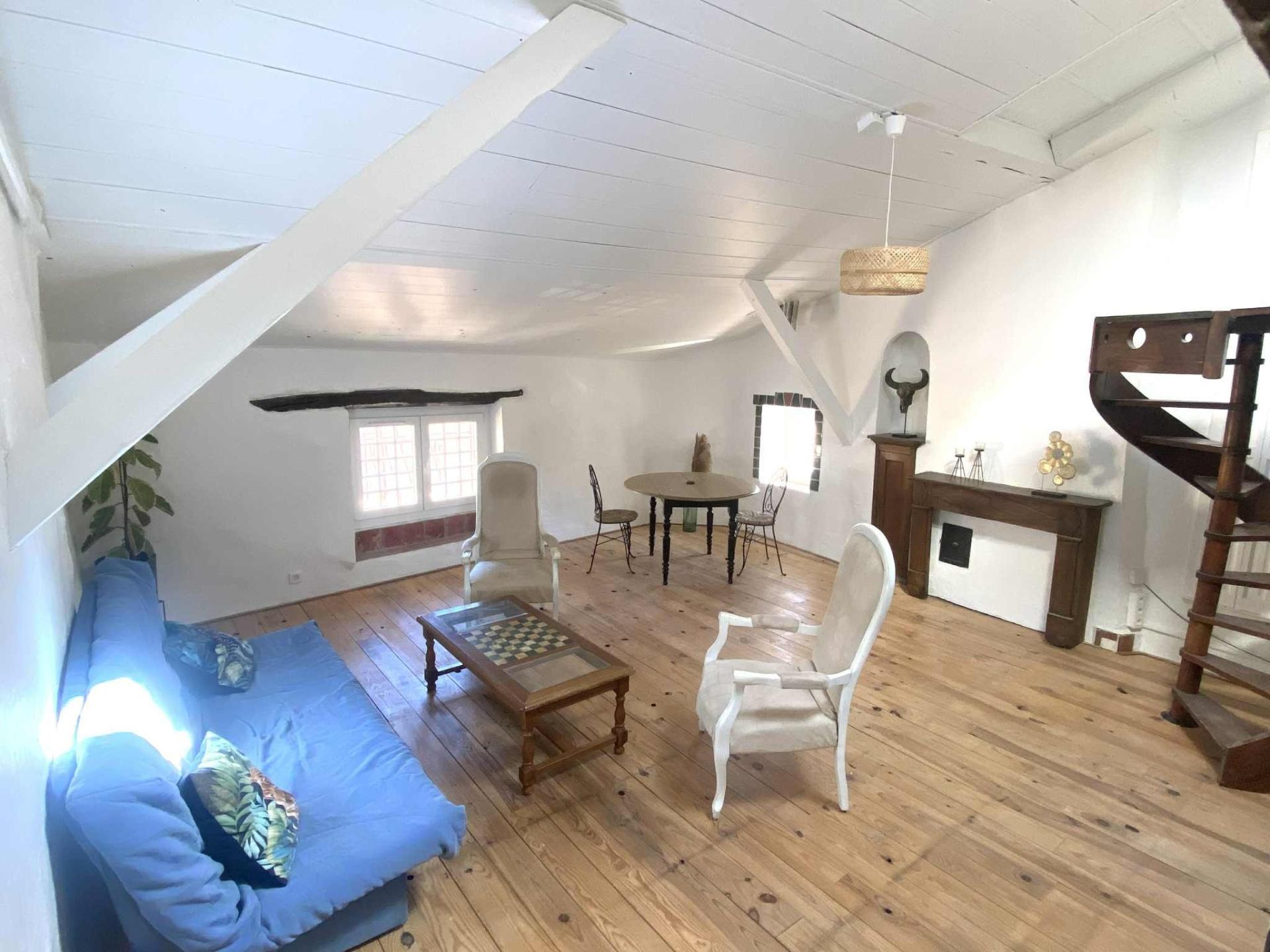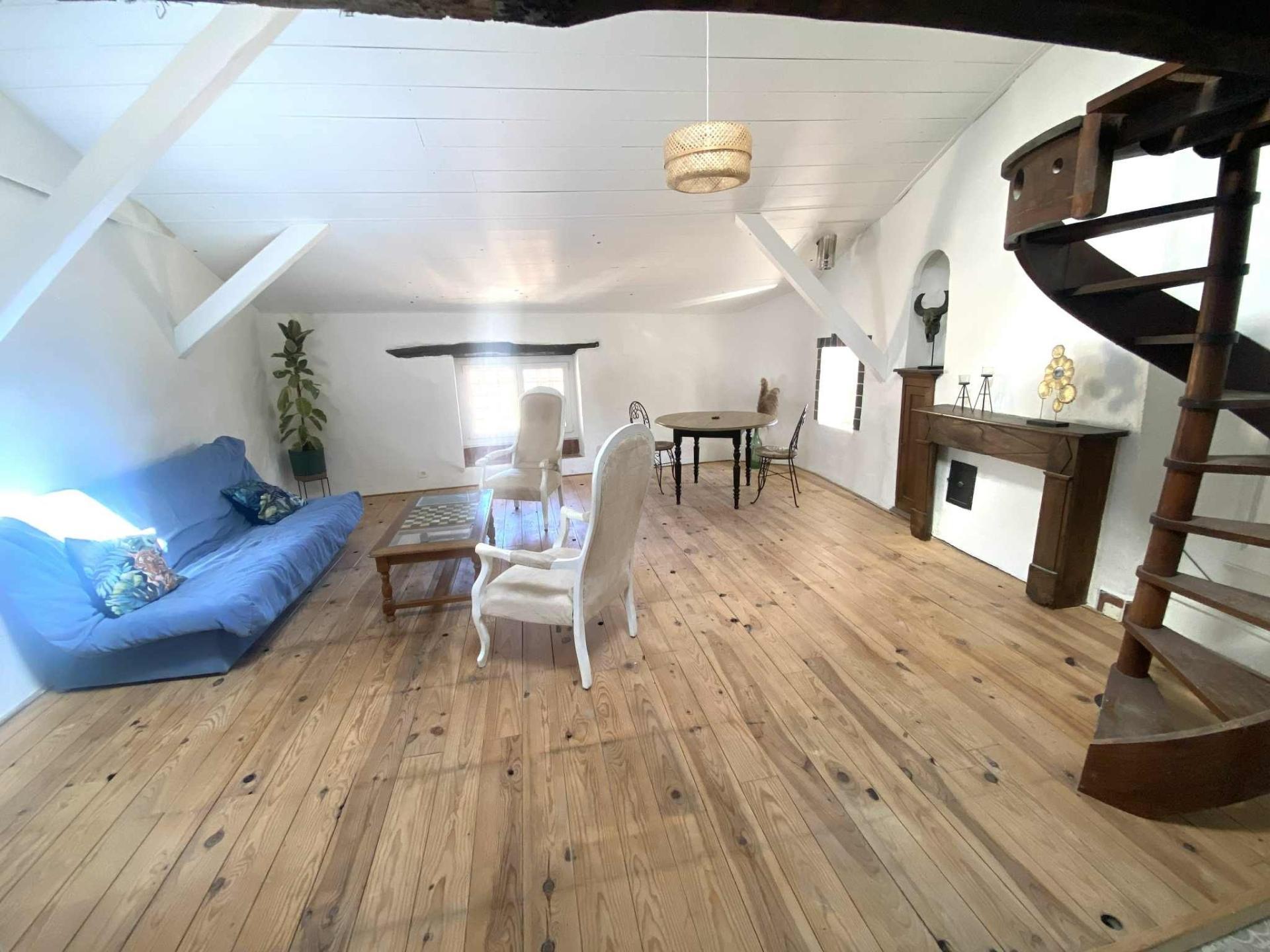 - un grand séjour donnant sur une cuisine ouverte, escaliers en colimaçon, poutres apparentes et parquet massif