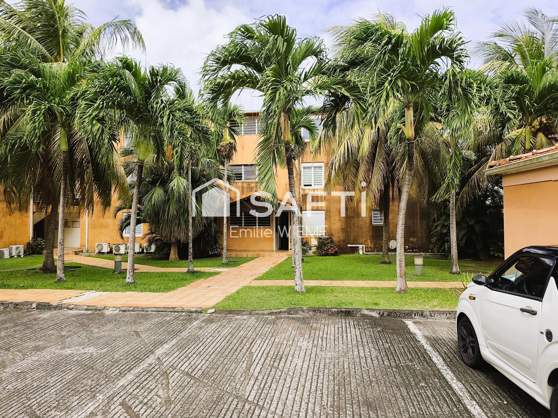 La résidence, entourée de palmiers royaux et de jardins entretenus, offre un cadre de vie calme et résidentiel, à seulement 2 km du centre de Ducos et 4 km de l'aéroport.
