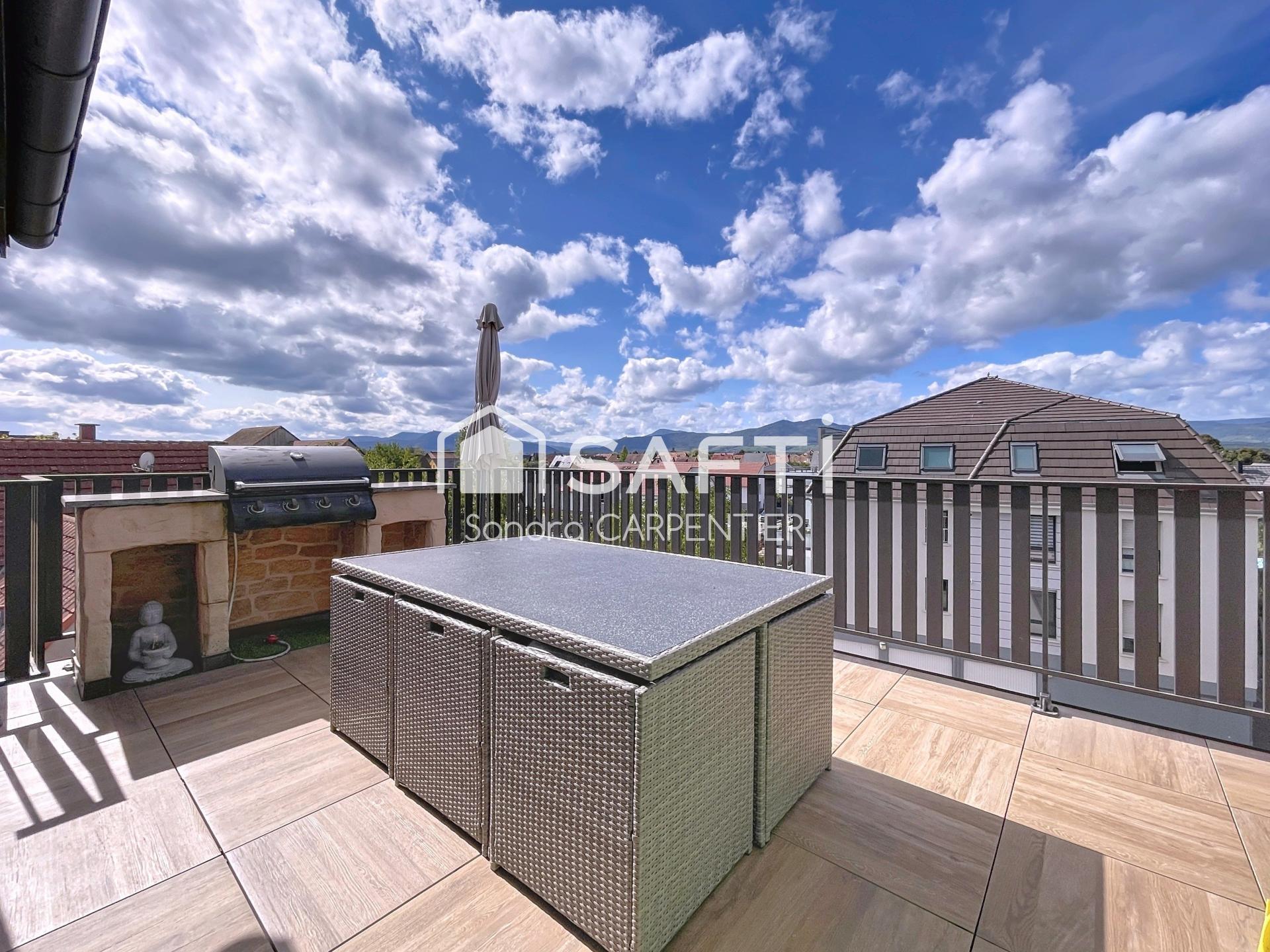Vous serez immédiatement séduit par ses volumes généreux et sa luminosité exceptionnelle. L’espace de vie comprend une cuisine équipée moderne ouverte sur un vaste séjour baigné de lumière, avec accès direct à une terrasse de 21 m² offrant une vue dégagée sur le massif vosgien et la route des vins. Un cellier attenant à la cuisine apporte un espace de rangement très pratique au quotidien.