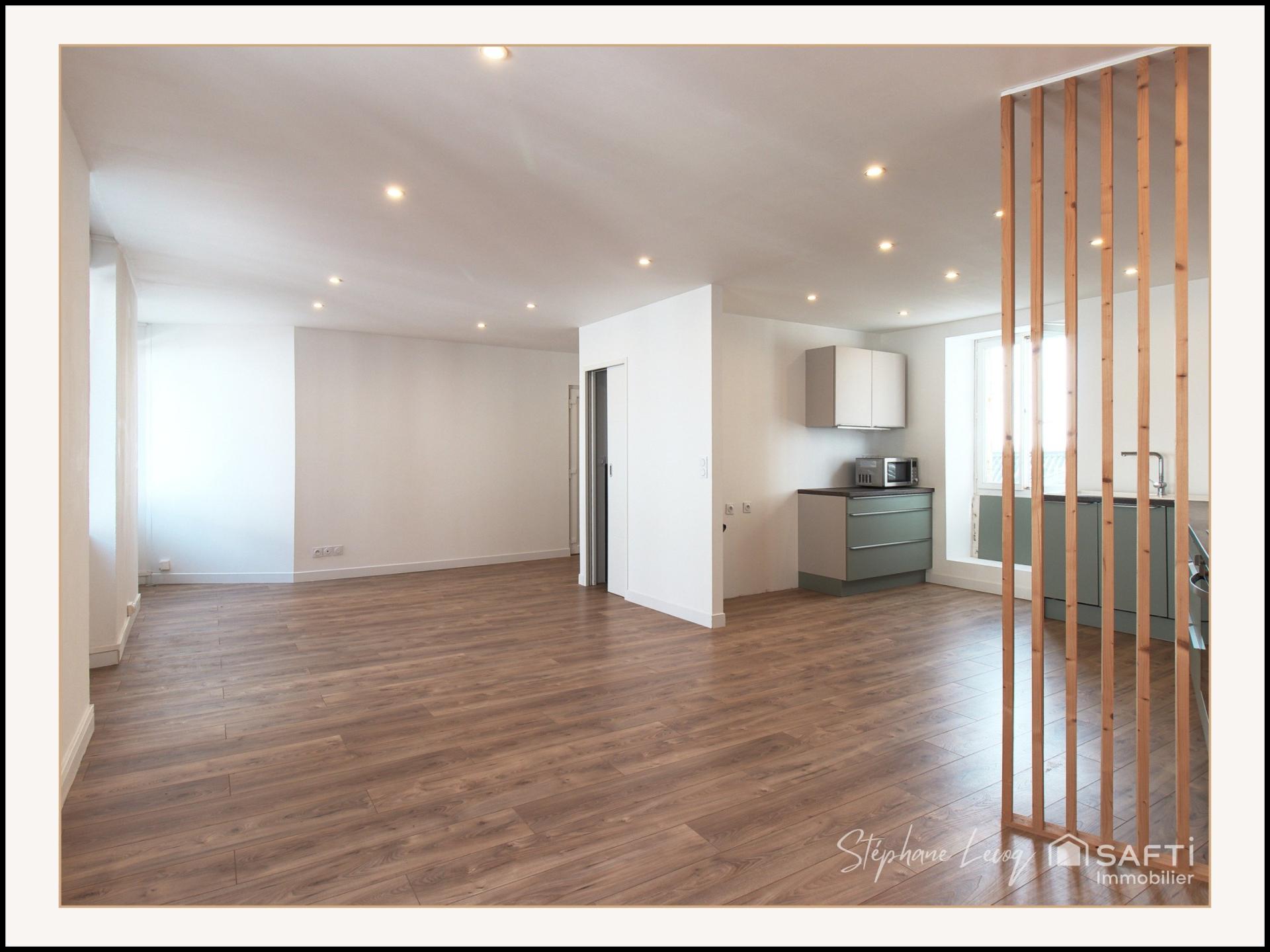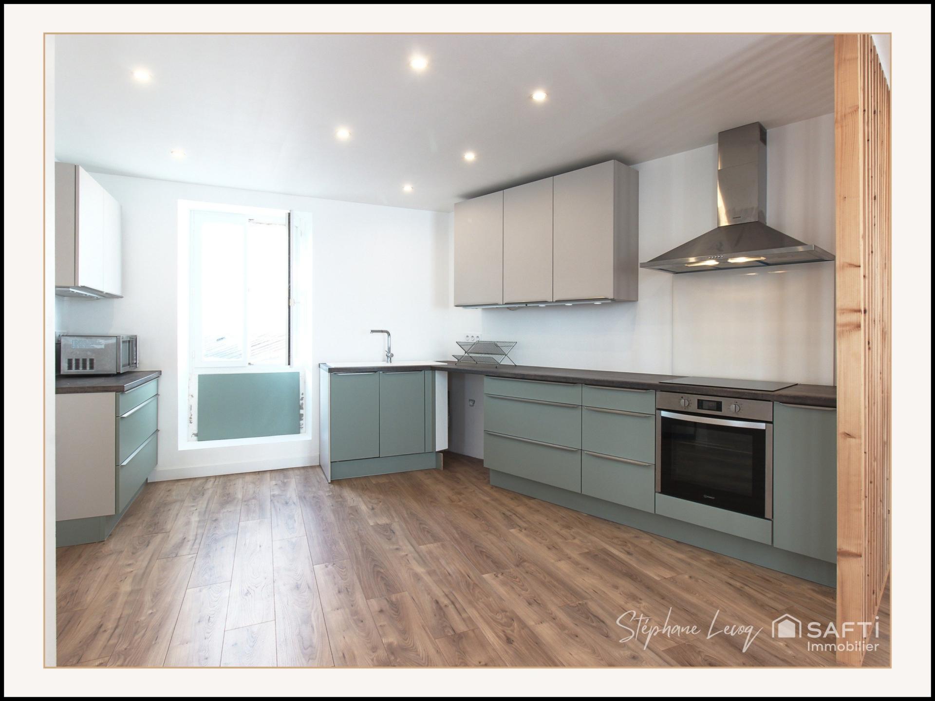Au cœur d'un immeuble, cet appartement de 103m² Carrez entièrement rénové s'étend sur le 1er étage. Son agencement atypique offre une belle cuisine ouverte sur une spacieuse pièce de vie, un cellier pratique et des toilettes pour la partie jour. Quant à la partie nuit, un couloir dessert les 3 chambres lumineuses et la salle de bain/douche avec espace buanderie. Un bien alliant modernité et fonctionnalité au cœur de la vie animée d'Étel.