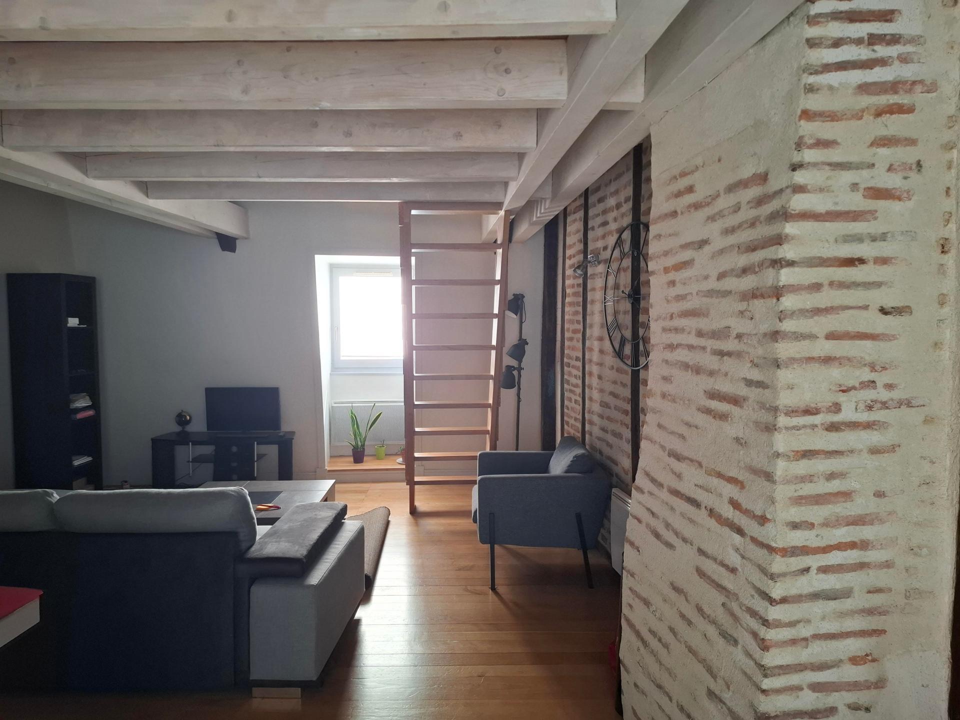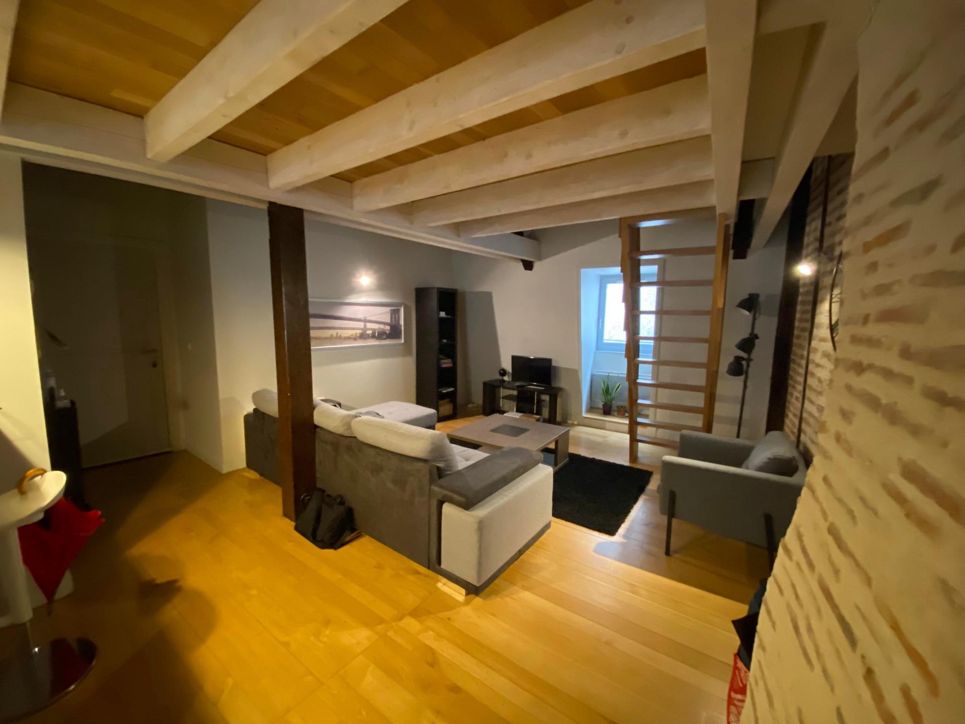 Ce duplex rénové en 2009 offre un espace de vie confortable comprenant un séjour traversant avec cuisine équipée de 30 m², une chambre avec charpente apparente de 11,7 m², une salle de bain de 5,25 m², un WC séparé et une mezzanine de 8,7 m².