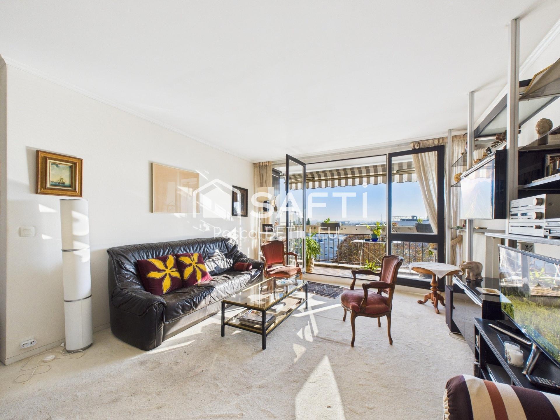 Une entrée avec dressing et wc invités, un séjour donnant sur un grand balcon avec une vue panoramique sur Paris,