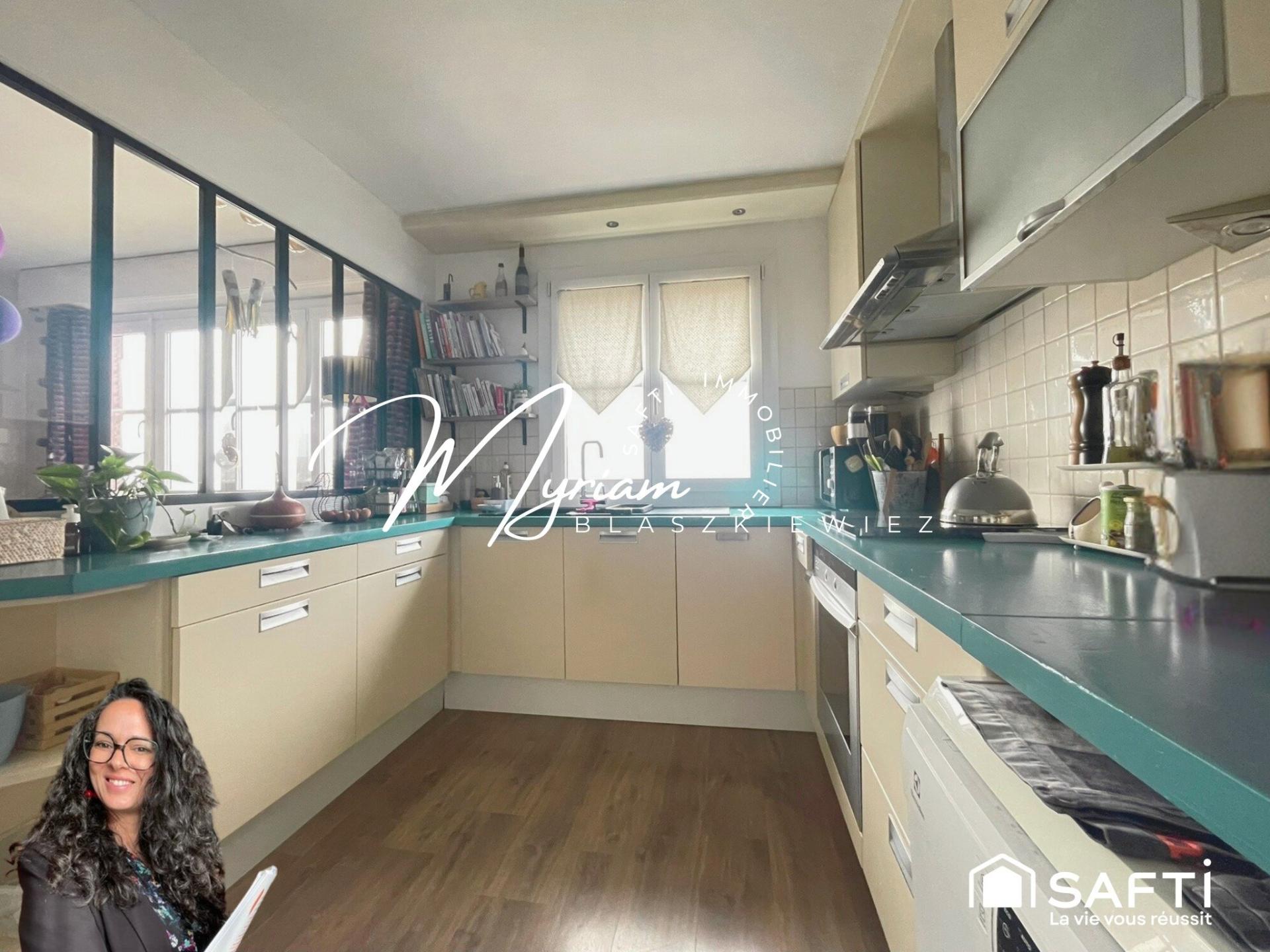 Le séjour, confortable et accueillant, s’articule naturellement autour d’une cuisine indépendante équipée, mise en valeur par une verrière qui laisse circuler la lumière tout en préservant les usages. L’ensemble crée un espace de vie harmonieux, à la fois fonctionnel et chaleureux.