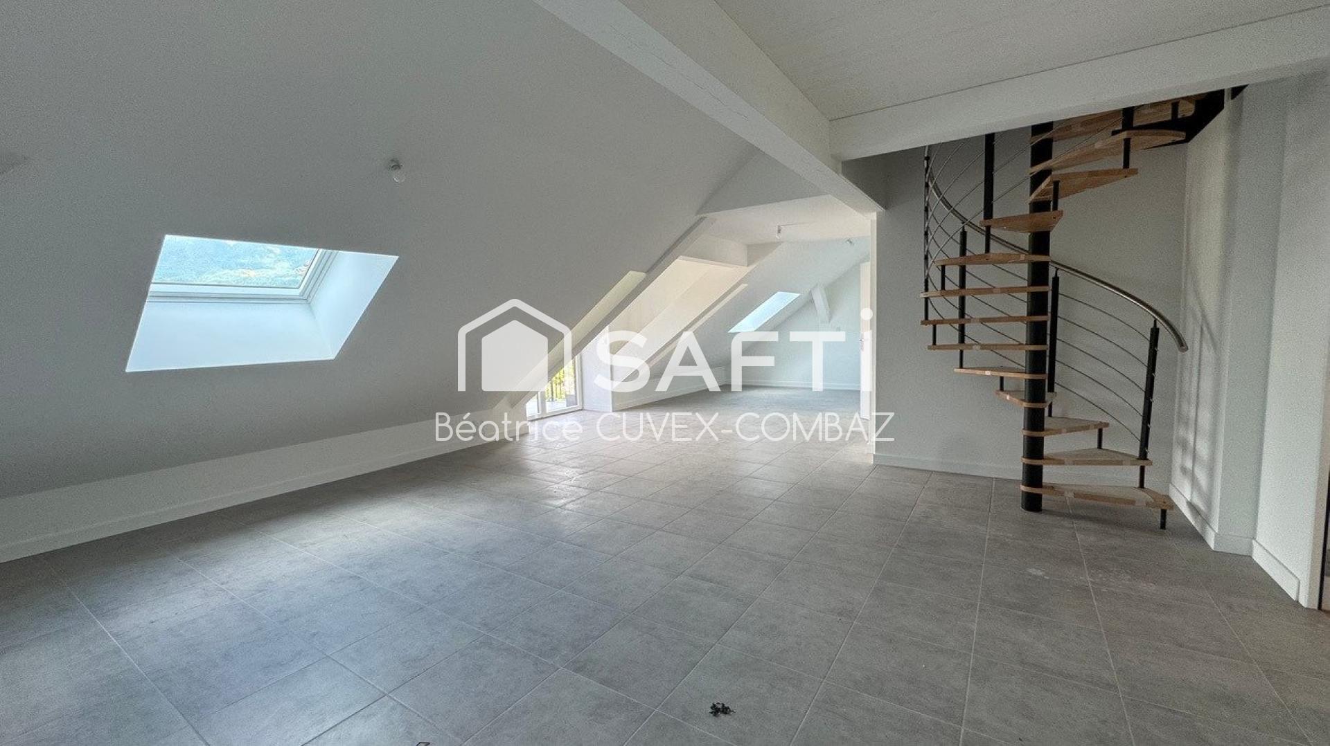 Duplex neuf de bon standing, au 2e étage d'une copropriété de 3 appartements, 131 m2 au sol et 93 m2 loi Carrez, en centre village, proche commerces et écoles. 3 chambres dont 1 suite parentale, 1 coin nuit, 2 WC, 1 salle de bains et 1 salle d'eau, cuisine ouverte sur séjour. Chauffage: pompe à chaleur individuelle sur plancher chauffant. Terrasse Sud-ouest avec vue montagne.