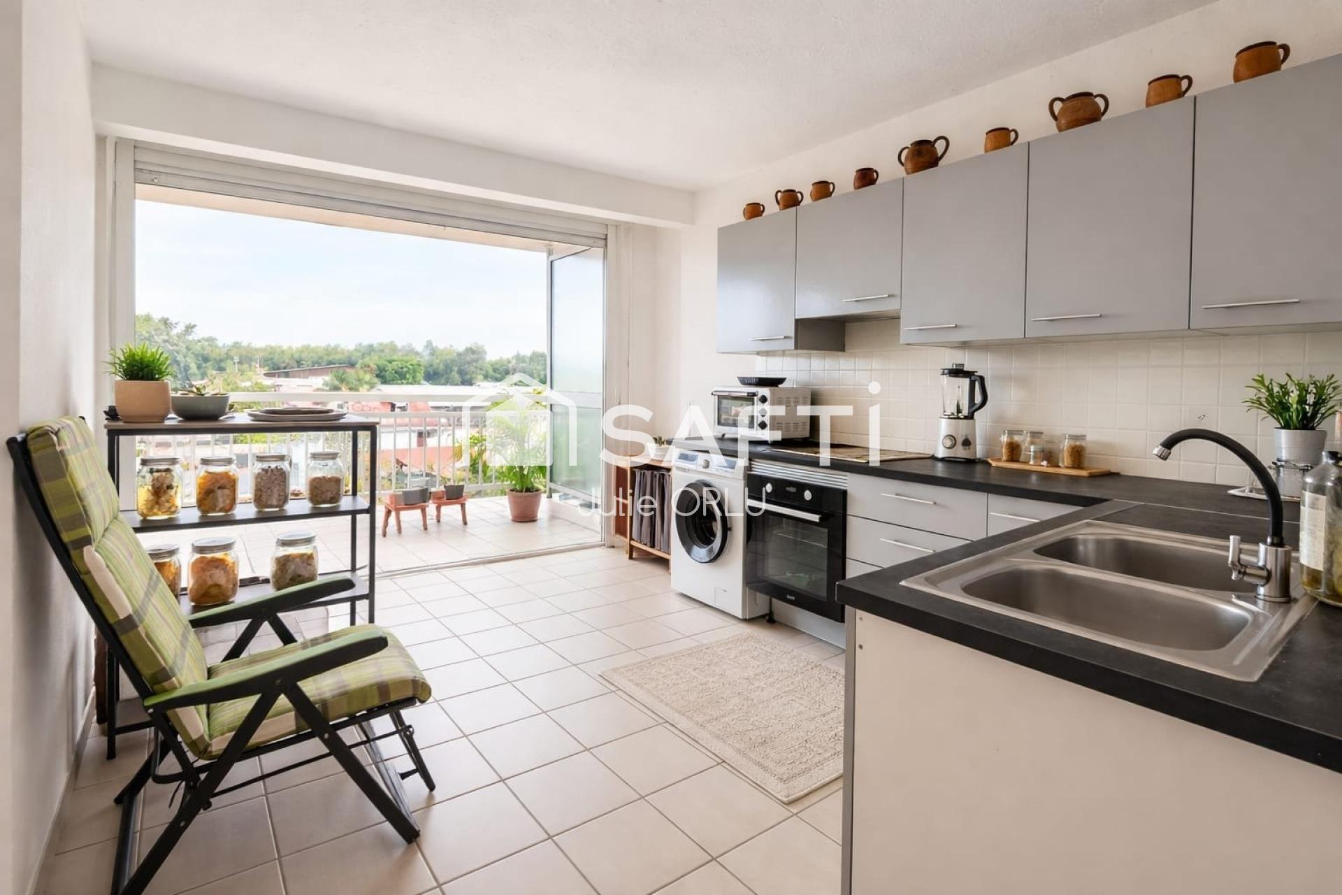 Découvrez un espace fonctionnel comprenant une buanderie, un WC indépendant ainsi qu’une grande cuisine ouverte sur un balcon terrasse offrant une vue dégagée.