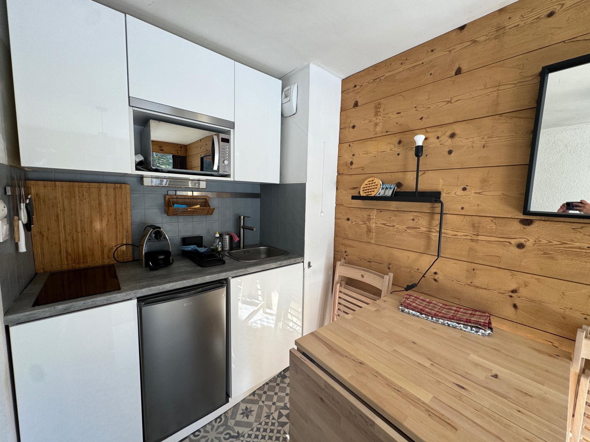 Facile d’accès , cet appartement confortable habillé de bois, propose un coin montagne et placard, une salle de bain spacieuse avec toilettes; et un séjour chaleureux avec kitchenette équipée.