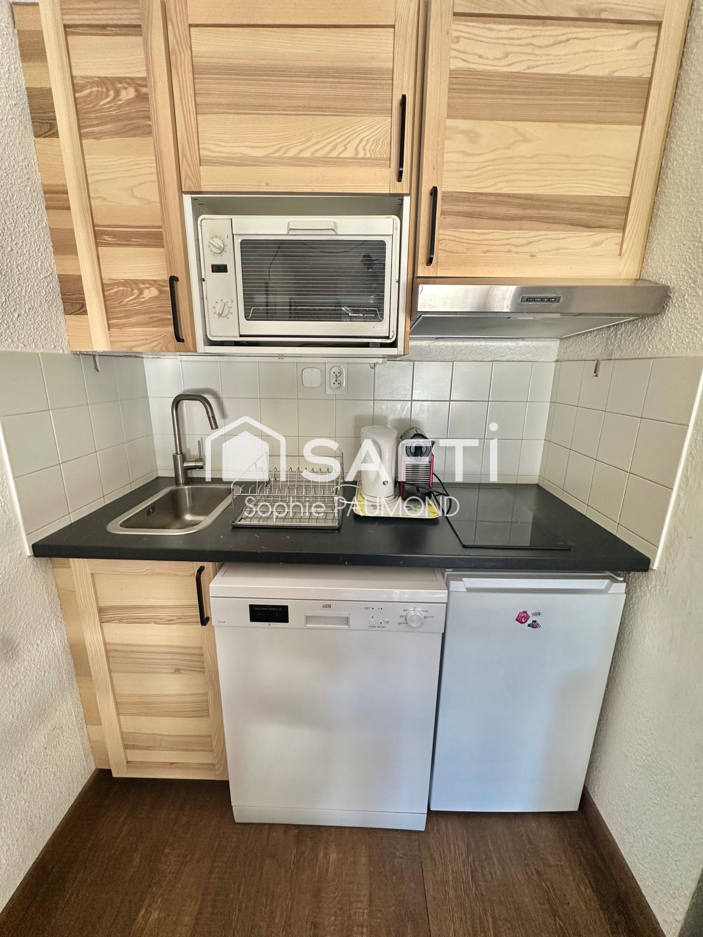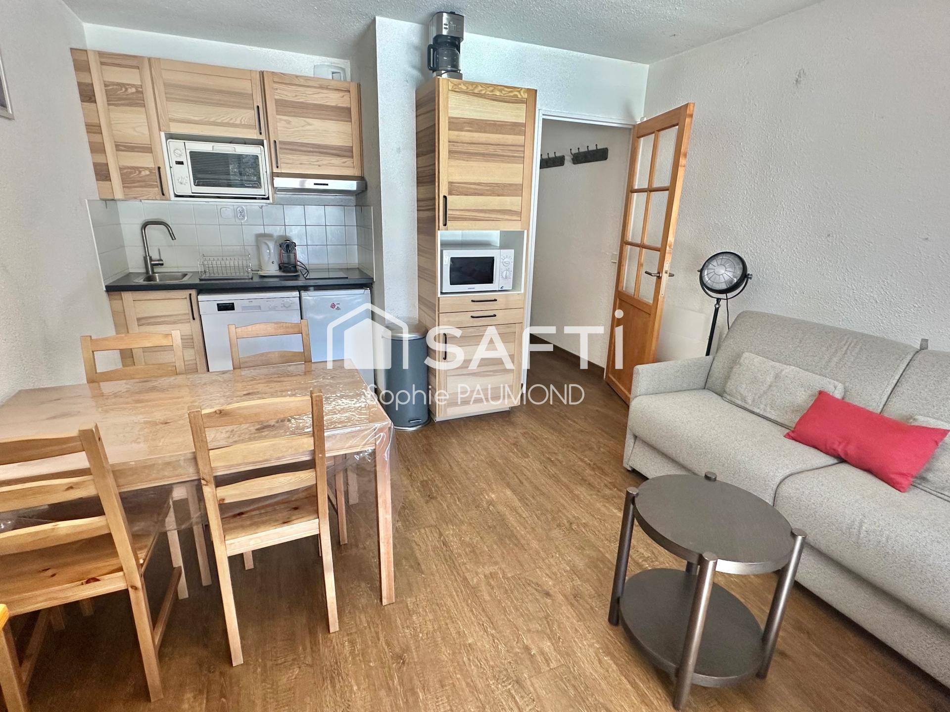 La Salle Les Alpes, à proximité immédiate des pistes de ski, dans une petite copropriété bien entretenue avec piscine, un appartement de type T1 plus coin montagne, vendu meublé et équipé au rez-de-chaussée d'une surface habitable de 27,33 m2, comprenant: une entrée avec placard, un séjour avec coin cuisine, un coin montagne avec lits superposés et fenêtre, une salle de bains avec sèche-serviettes, des WC séparés et: