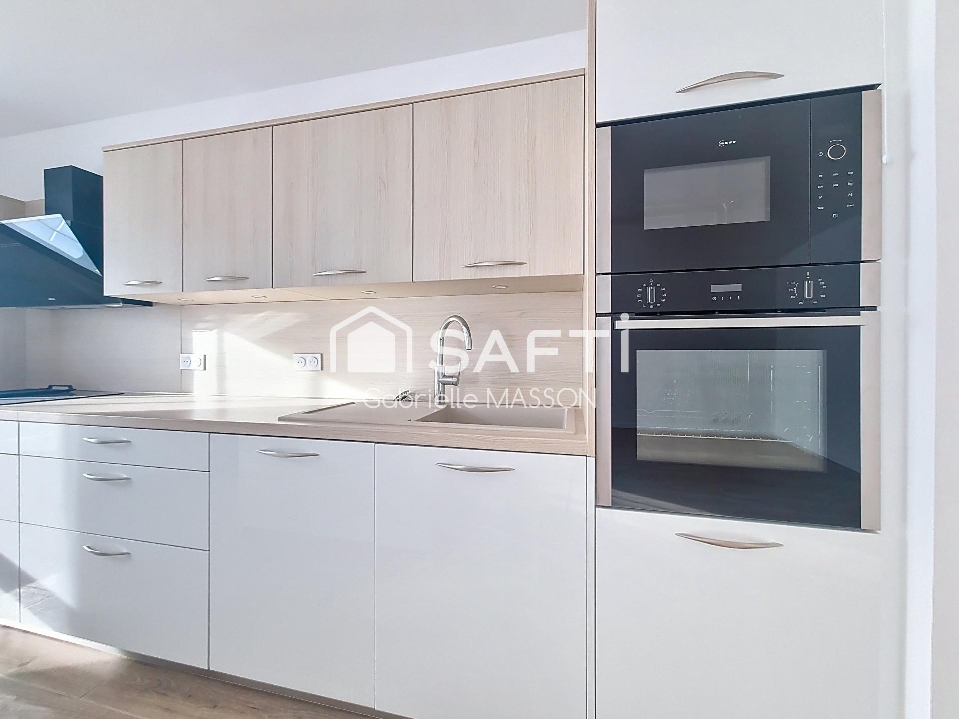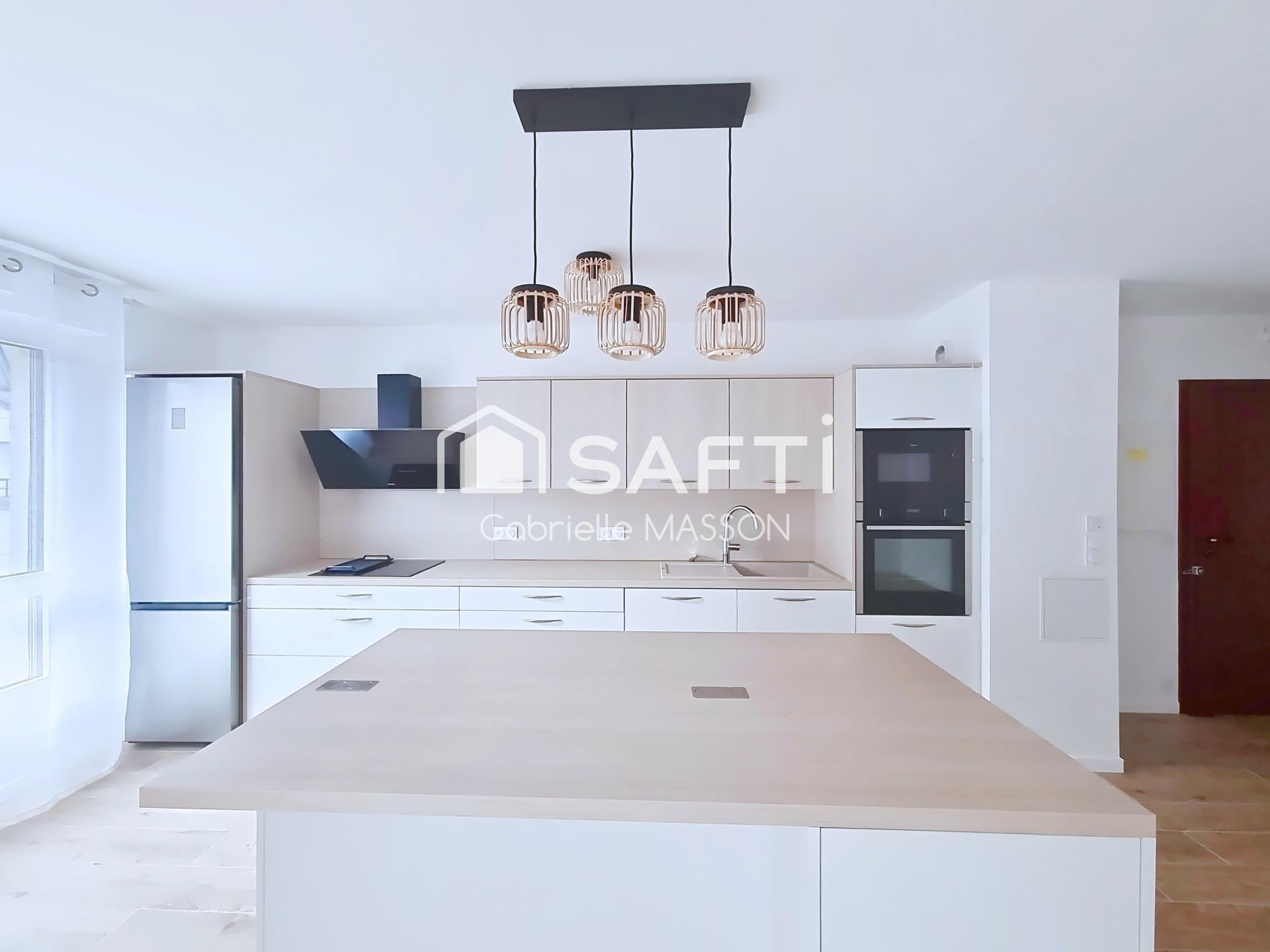 Une cuisine ouverte avec îlot central haut de gamme, entièrement équipée et neuve