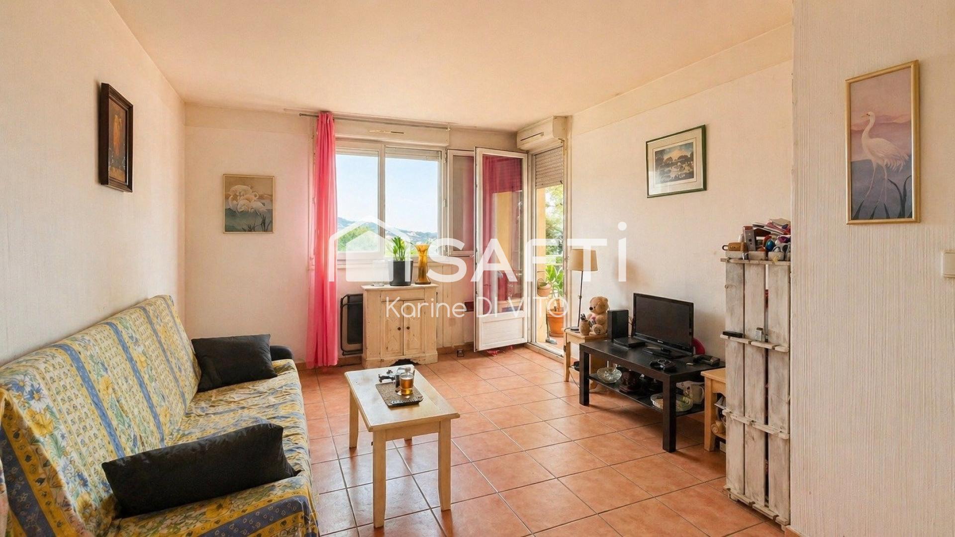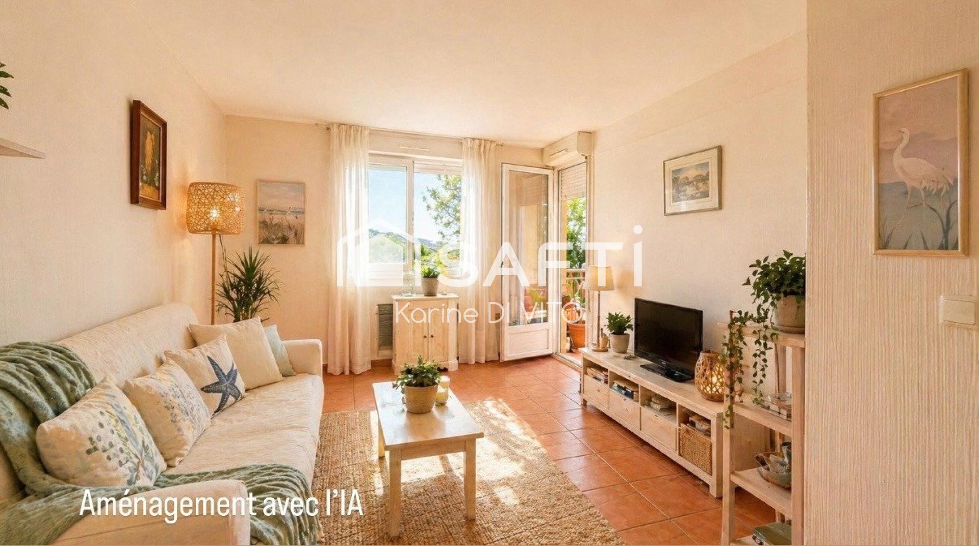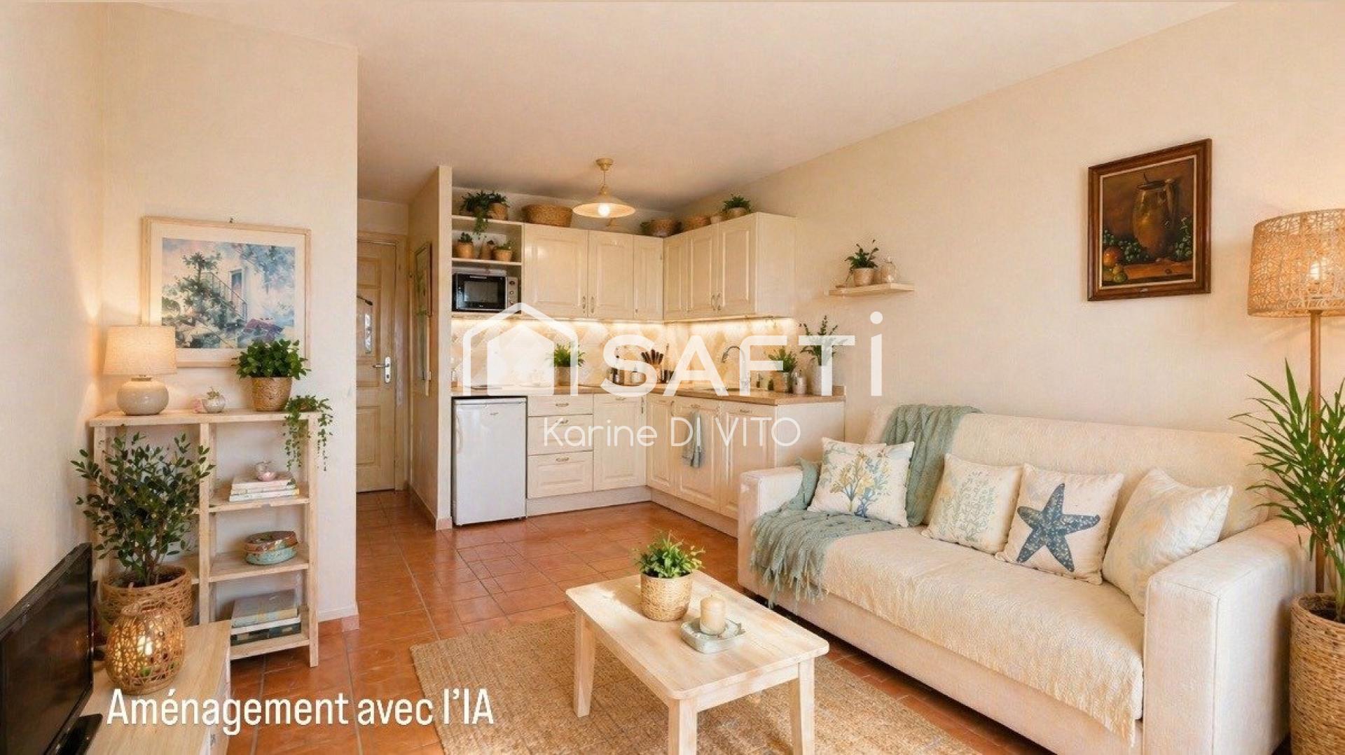 Ce 2 pièces à rafraîchir de 36 m2 sans vis-à-vis et au calme est situé au rez-de-chaussée surélevé d'une résidence sécurisée avec piscine. Il comprend un séjour-cuisine s'ouvrant sur une terrasse avec une jolie vue mer, une chambre confortable, une salle de bain ainsi qu'un toilette séparé.