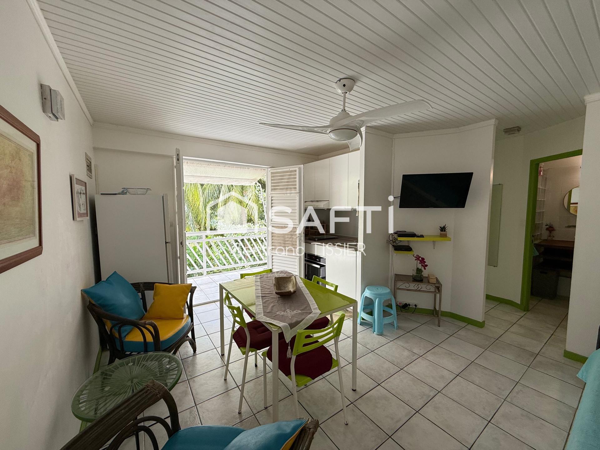 Bertrand TISSIER vous propose, en exclusivité, situé à l'Anse à l'Ane, aux Trois-Ilets, dans une résidence prisée et bien entretenue avec piscine, ce bel appartement de type 2 offre un cadre de vie agréable à deux pas des plus belles plages du Sud. Il se compose d’une pièce à vivre lumineuse avec cuisine ouverte, d’une chambre, d’une salle de bain avec WC, et d’une agréable terrasse couverte idéale pour profiter du climat tropical.