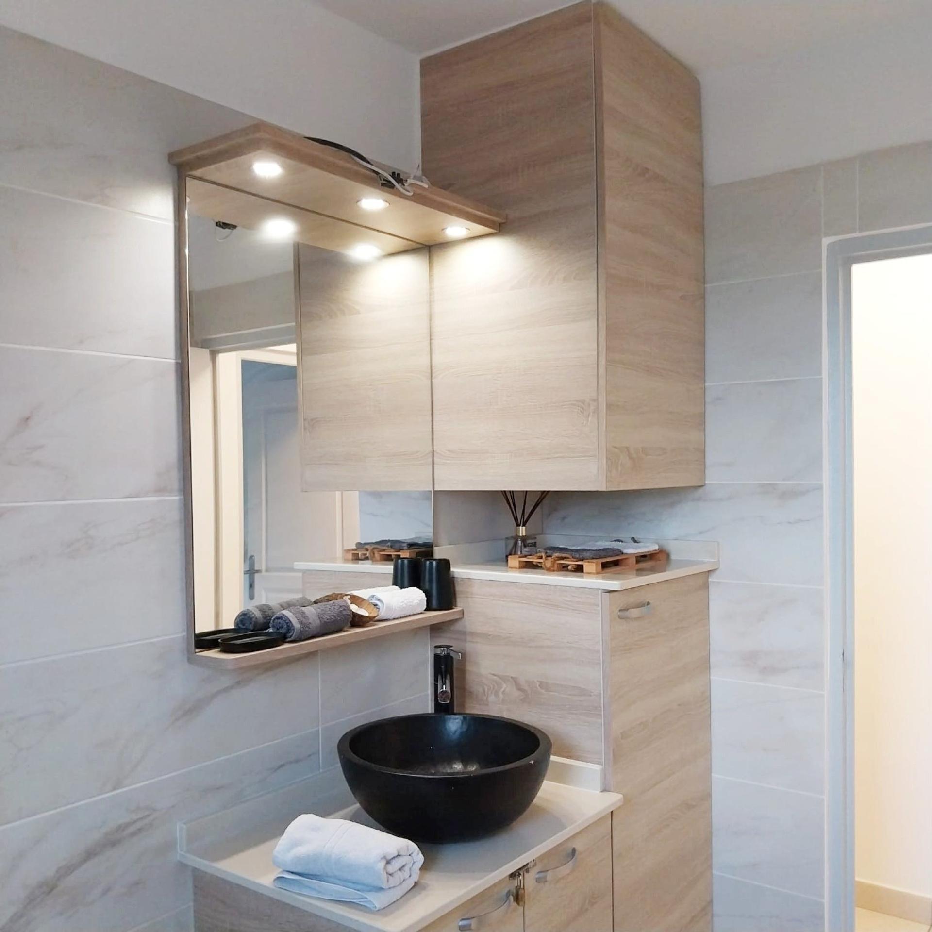 - Salle d’eau : Moderne avec une véritable douche à l’italienne, une simple vasque et un toilette.