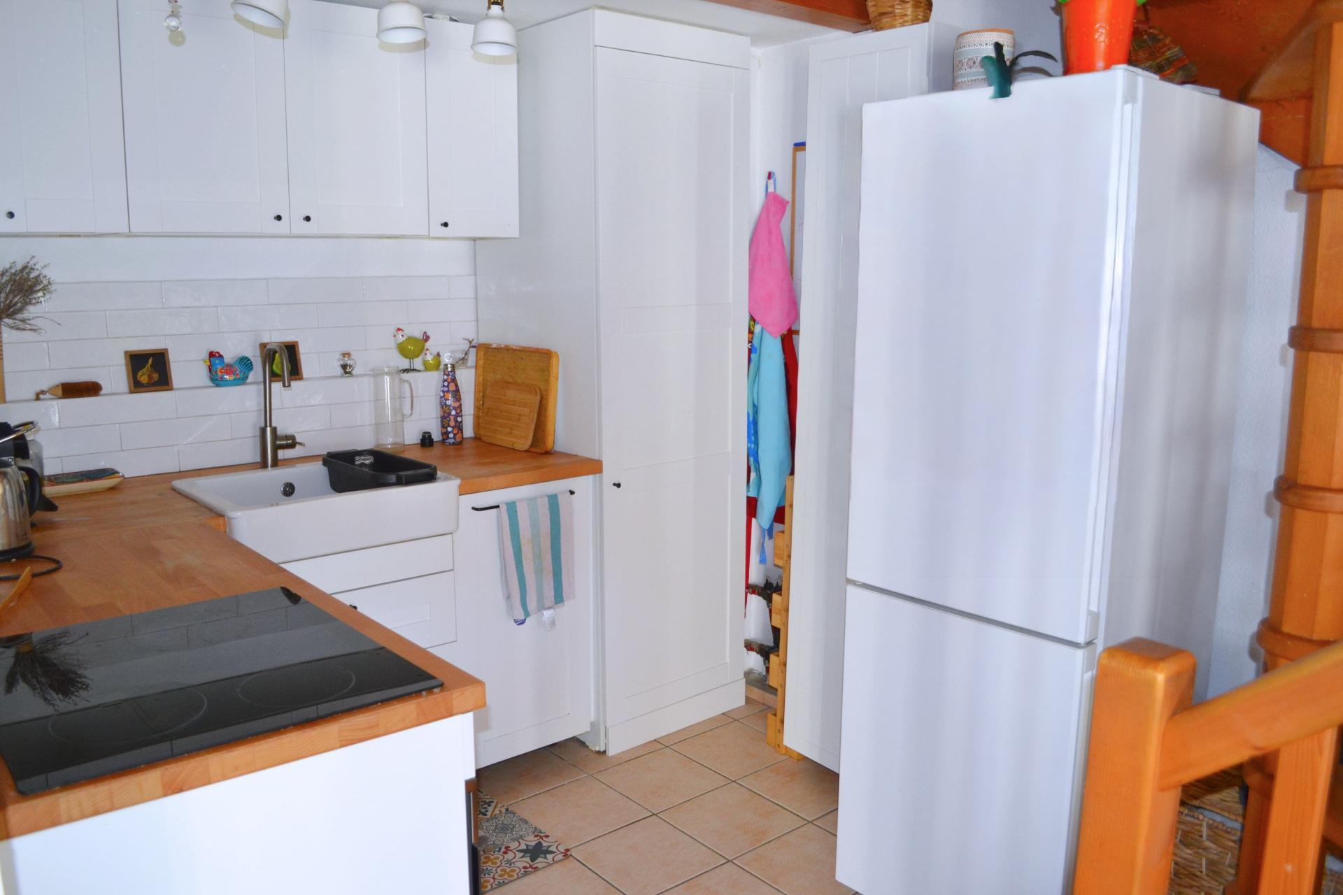 Composé d'une entrée avec rangements, un wc indépendant, d'une cuisine aménagée et équipée ouverte sur le salon et, au premier étage, de deux chambres et d'une salle d'eau avec wc.