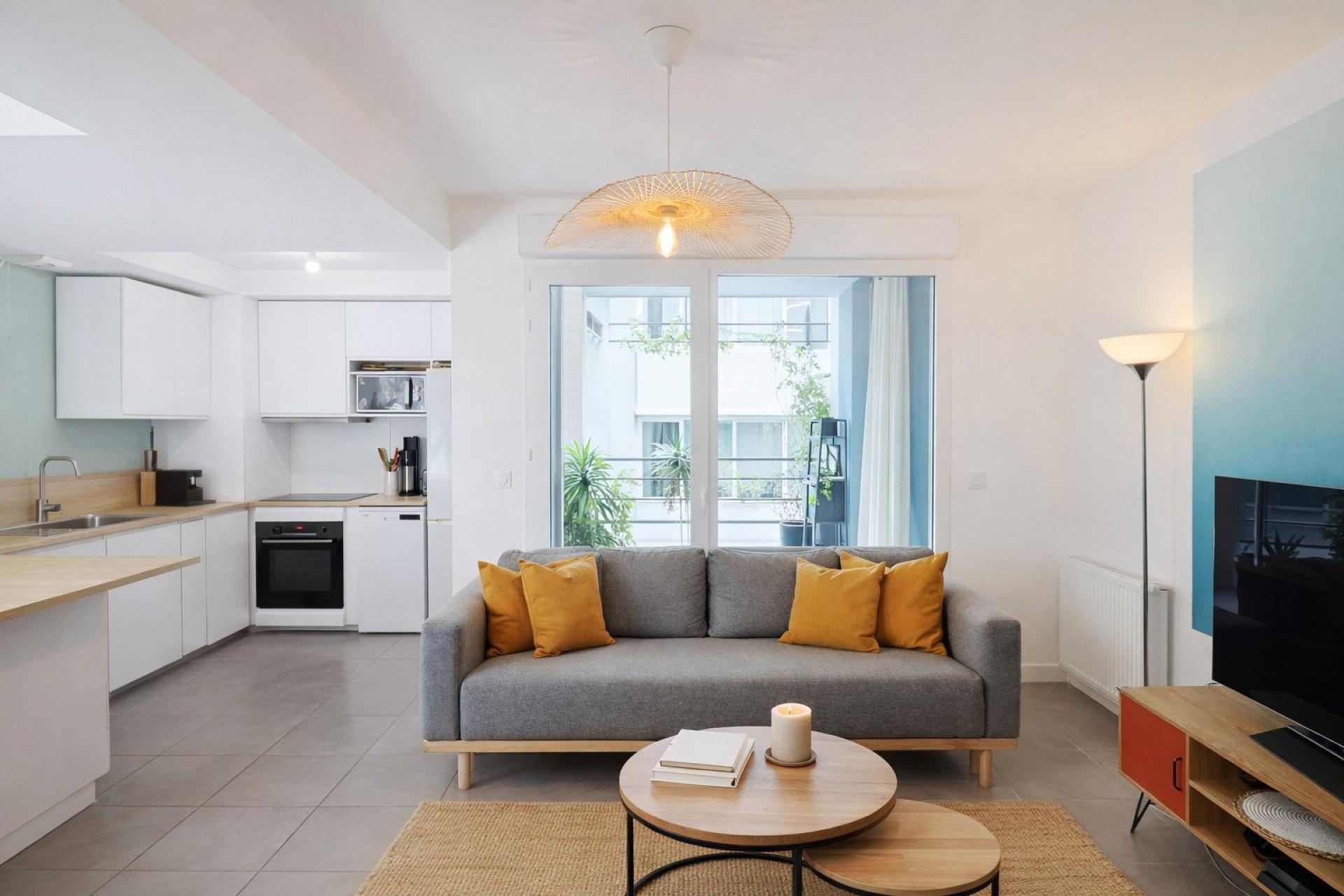 L’appartement propose un séjour lumineux avec cuisine entièrement équipée, idéal pour un quotidien convivial.