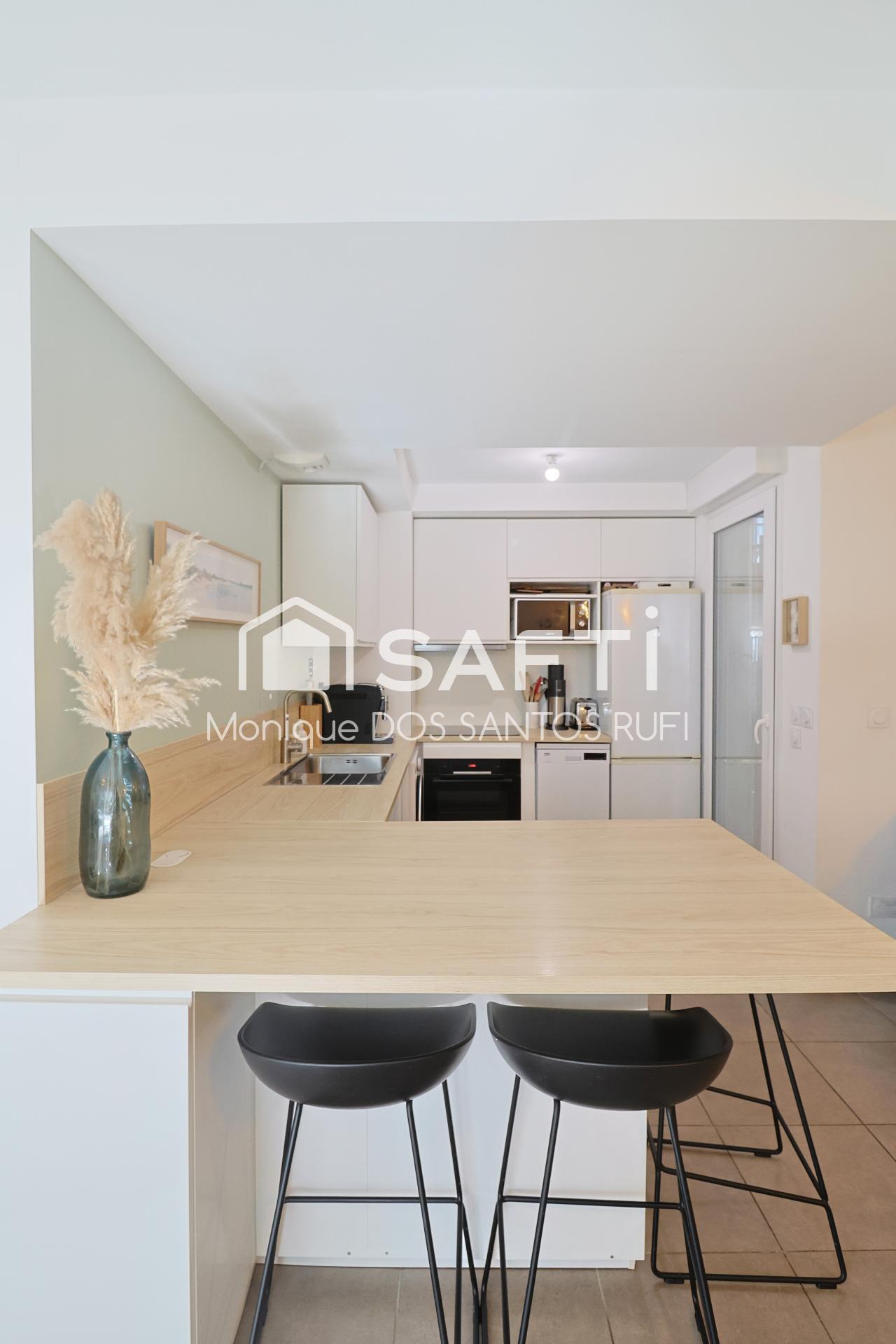 L’appartement propose un séjour lumineux avec cuisine entièrement équipée, idéal pour un quotidien convivial.