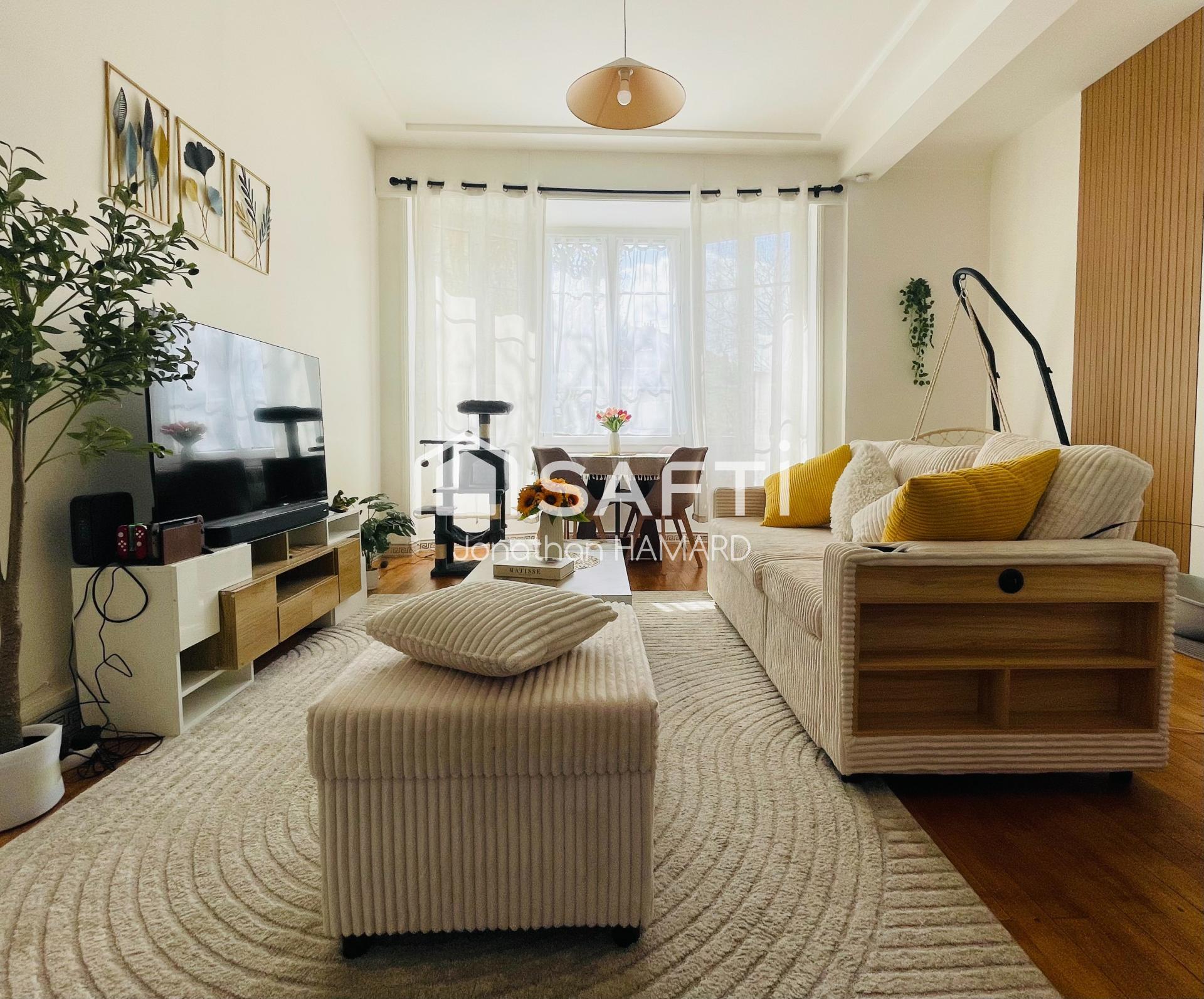 L'espace de vie se compose d'un salon spacieux avec cuisine ouverte, baigné de lumière naturelle, offrant une atmosphère conviviale et chaleureuse. L'appartement dispose de trois chambres, dont une suite parentale avec salle d'eau privative, ainsi qu'une salle de bain indépendante. Une cave en sous-sol vient compléter ce bien, apportant un espace de rangement appréciable.