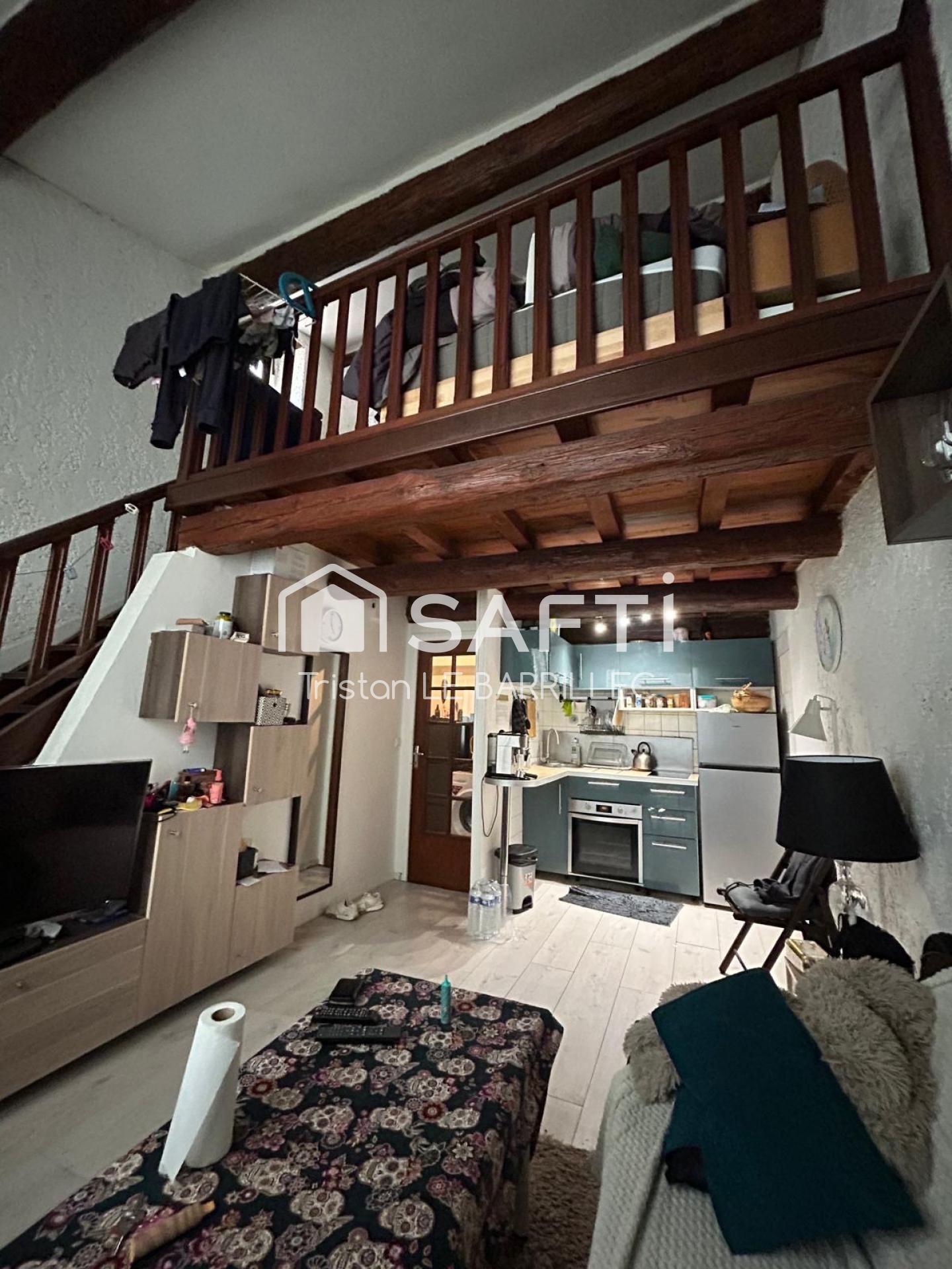 Il se compose d’une agréable pièce de vie avec mezzanine de plus de 2 mètres de hauteur sous plafond, une salle de bain et des toilettes. Le tout donne sur une cour privée au calme, un vrai atout en centre-ville.