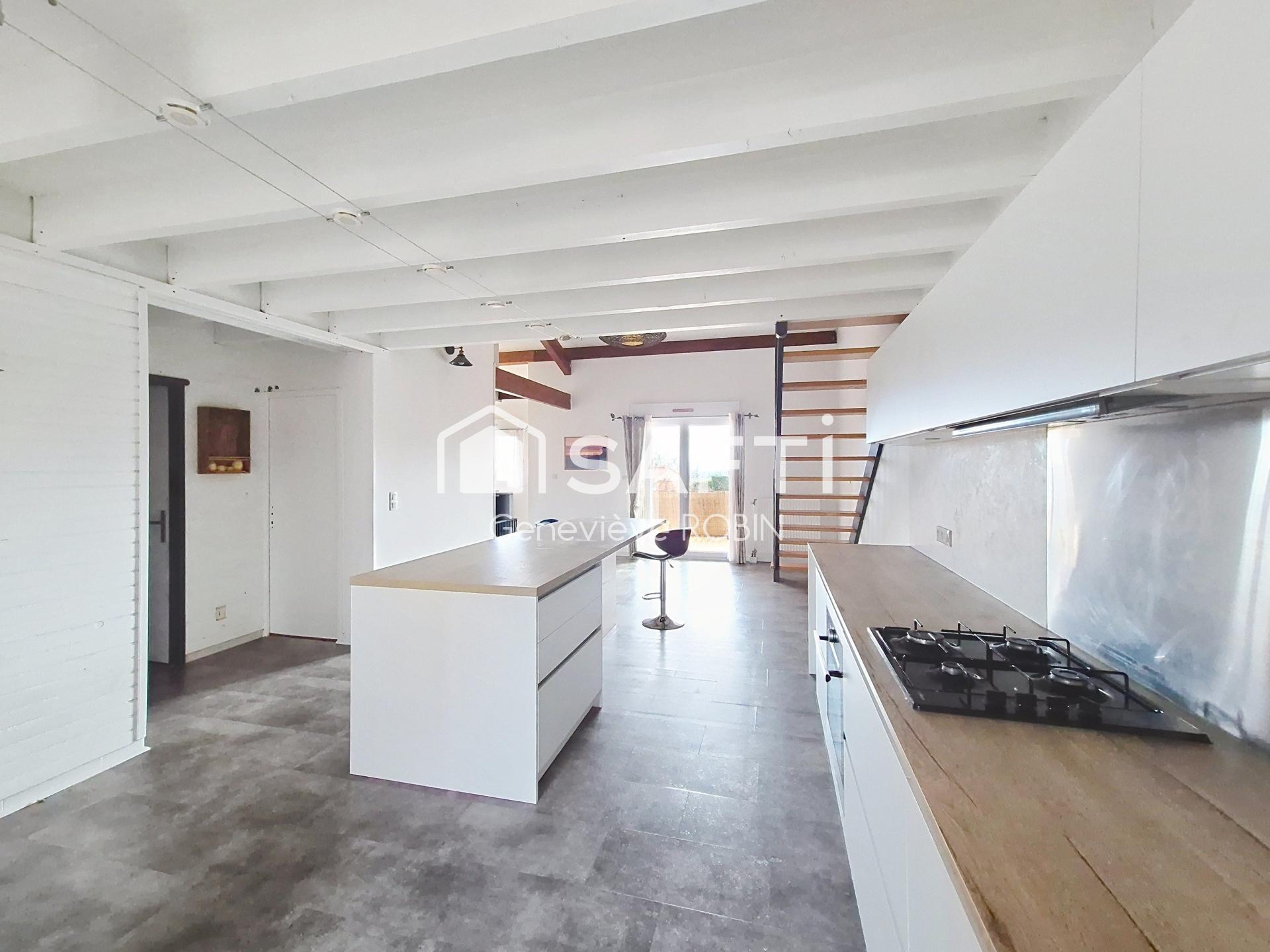 L'intérieur de ce bien se compose de 3 chambres, d'une vaste pièce de vie d'environ 60 m² avec cuisine ouverte équipée, d'une salle de bain, de toilettes séparés et d'une mezzanine de 20 m² au sol offrant un espace supplémentaire. L'agencement en duplex confère à ce logement une atmosphère chaleureuse et moderne, où les différentes pièces se complètent harmonieusement pour créer un lieu de vie fonctionnel et confortable.