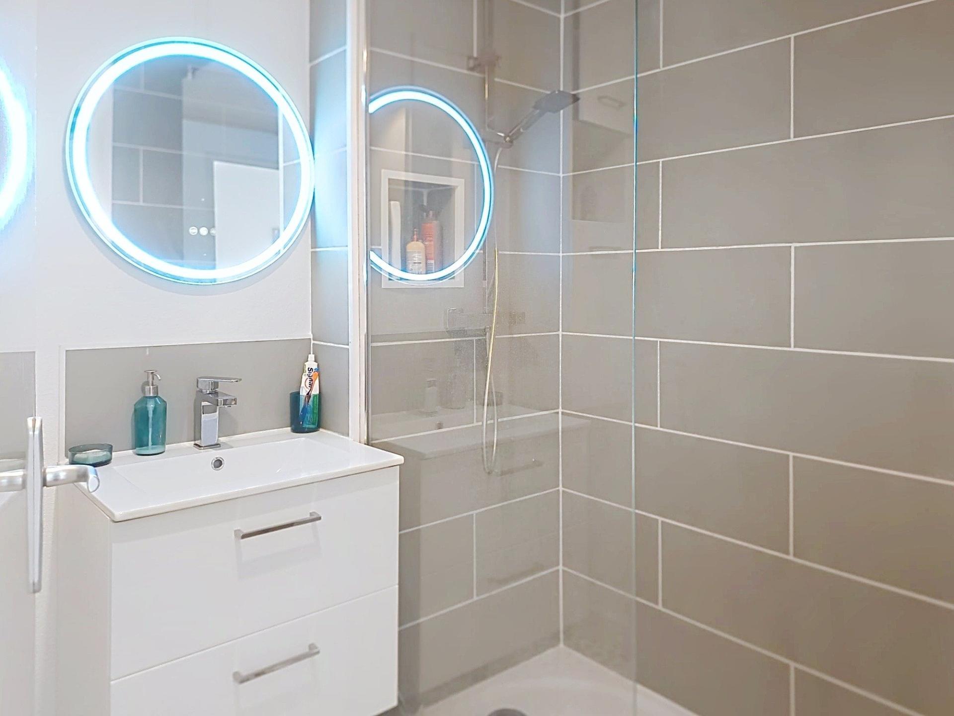 Situé au sein d'une copropriété sécurisée de 68 lots (+87 lots parking), cet appartement T2 de 44m2 environ, très lumineux, avec son balcon de 12m2 environ, se compose d'une chambre de 11m2 environ avec placard, d'un séjour avec cuisine américaine de 25,66m2, d'une salle d'eau de 2,95m2 avec douche à l'italienne et lavabo et d'un WC séparé de 1,23m2. Une place de parking privée et sécurisée vient compléter ce lot. Climatisation installée depuis 2025 et cumulus changé en Août 2025.
