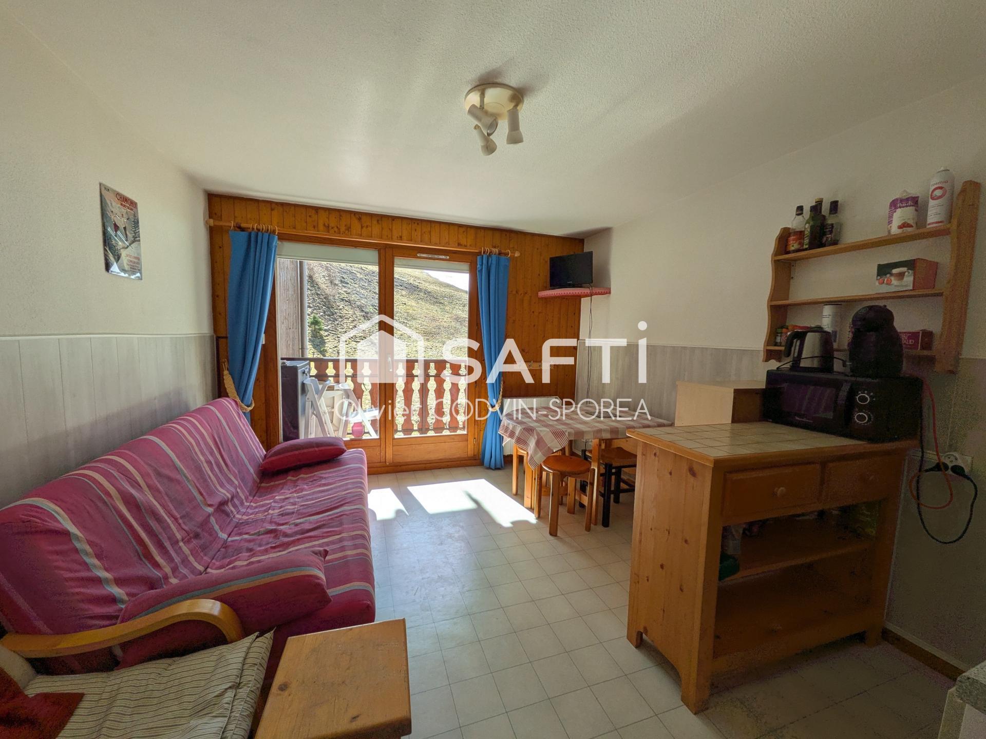 Studio cabine de 23m2 avec balcon exposé sud et casier à ski offrant une vue dégagée sur les alpages et montagnes environnantes.