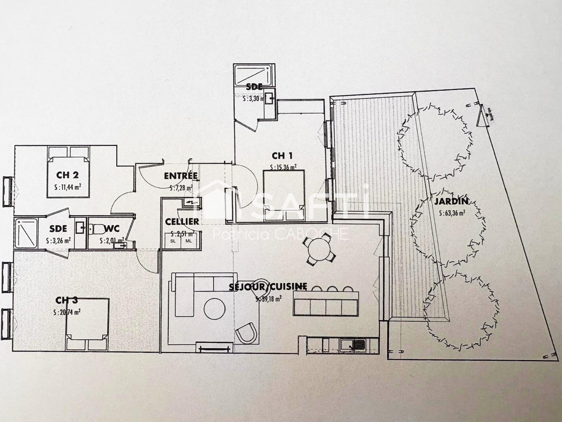 Il se compose d'une entrée avec placard de 7 m2, un salon séjour avec cuisine de 40 m2 ( ou 60 m2 si 2 chambres ) , ouvert sur le jardin par une verrière d'origine, réhabilitée, de 3 chambres ( 12 m2, 15 m2 et 20 m2) ou ( 12 m2, 15 m2 si 2 chambres ), deux salles d'eau, des toilettes séparées et d'un espace buanderie. Une cave complète le tout .