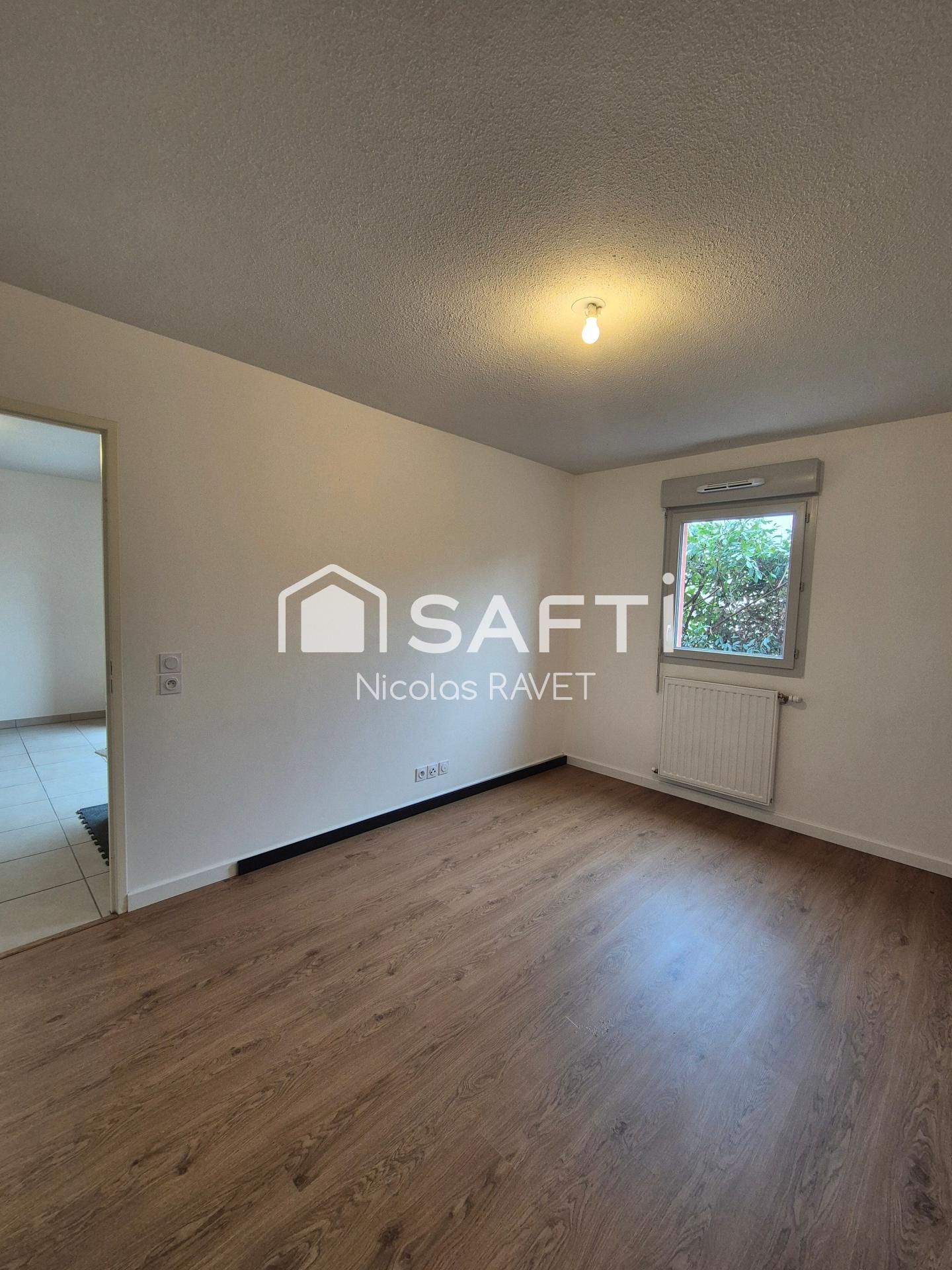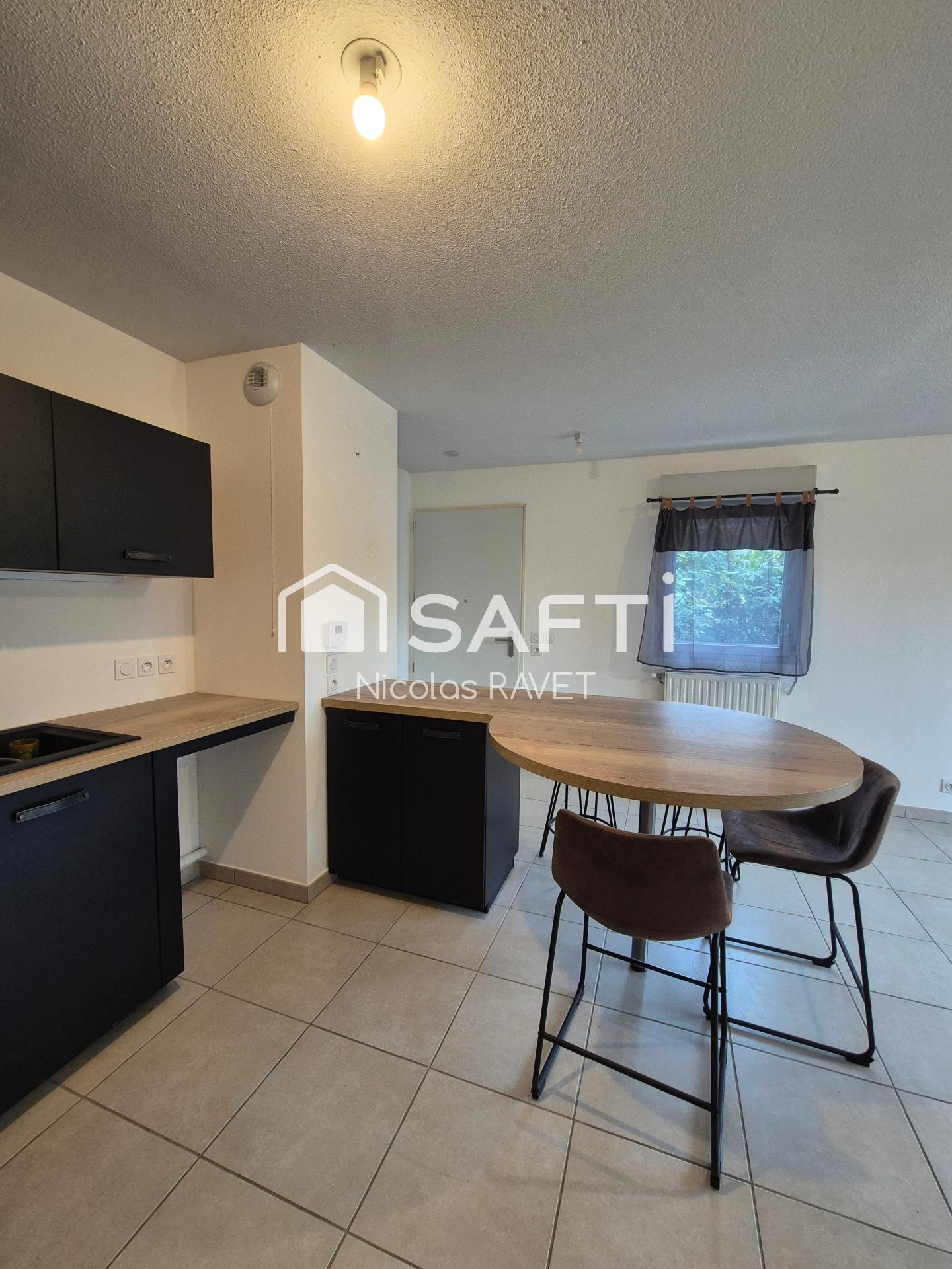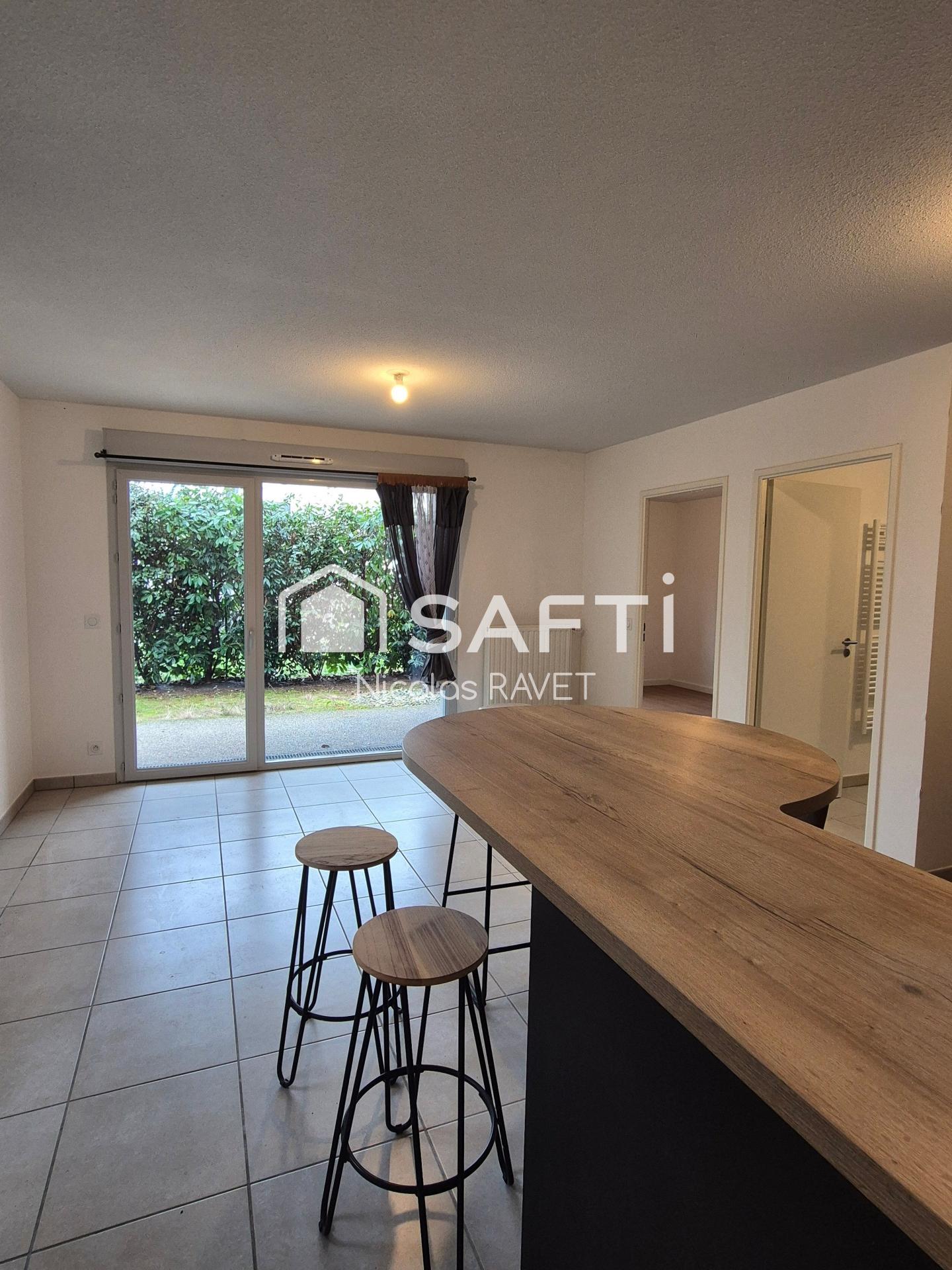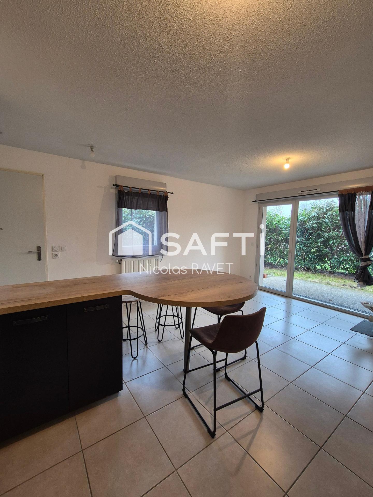 cuisine ouverte sur un salon et une salle d'eau avec WC. Il dispose également d'une terrasse de 8m2, d'un jardin