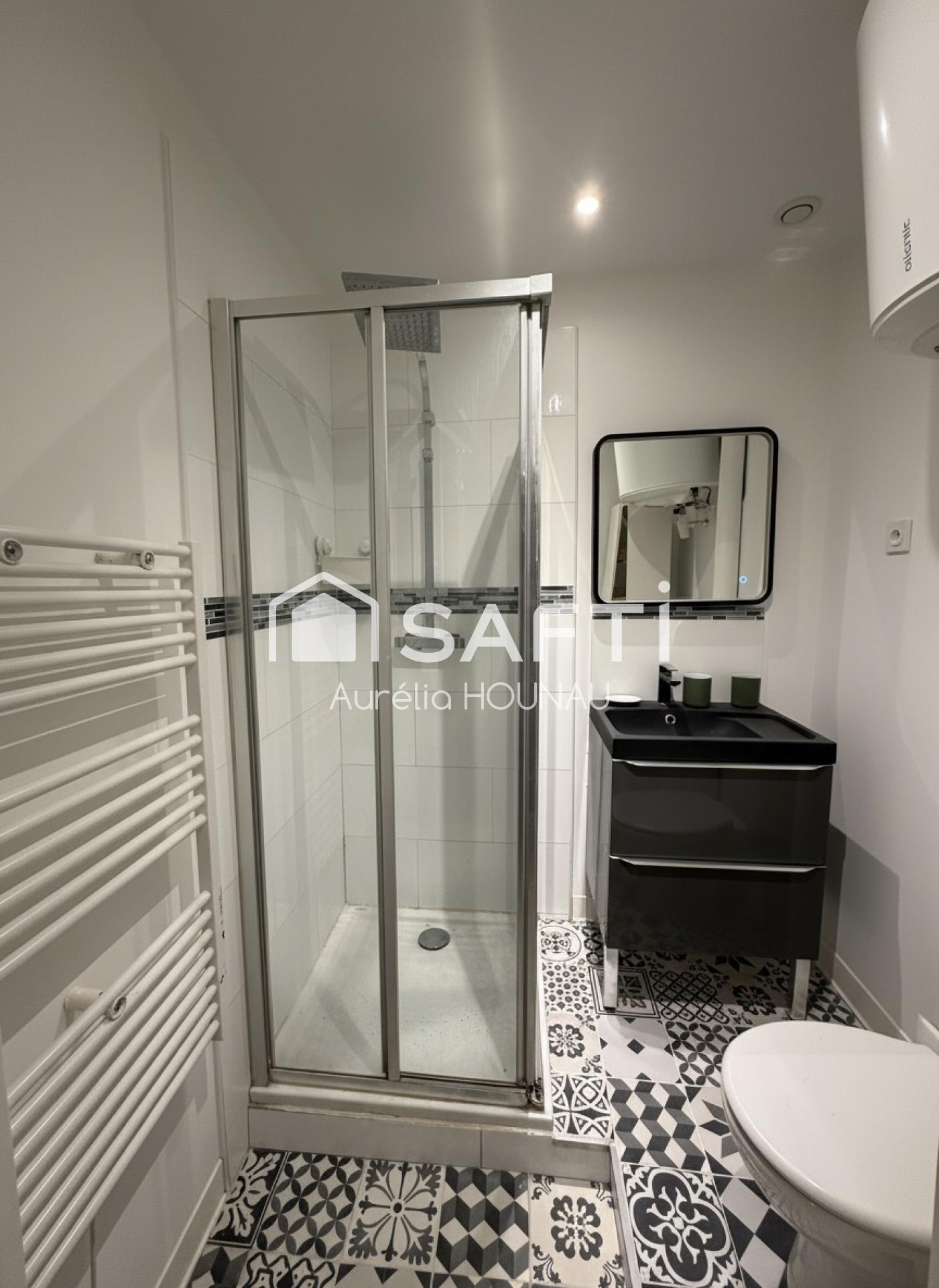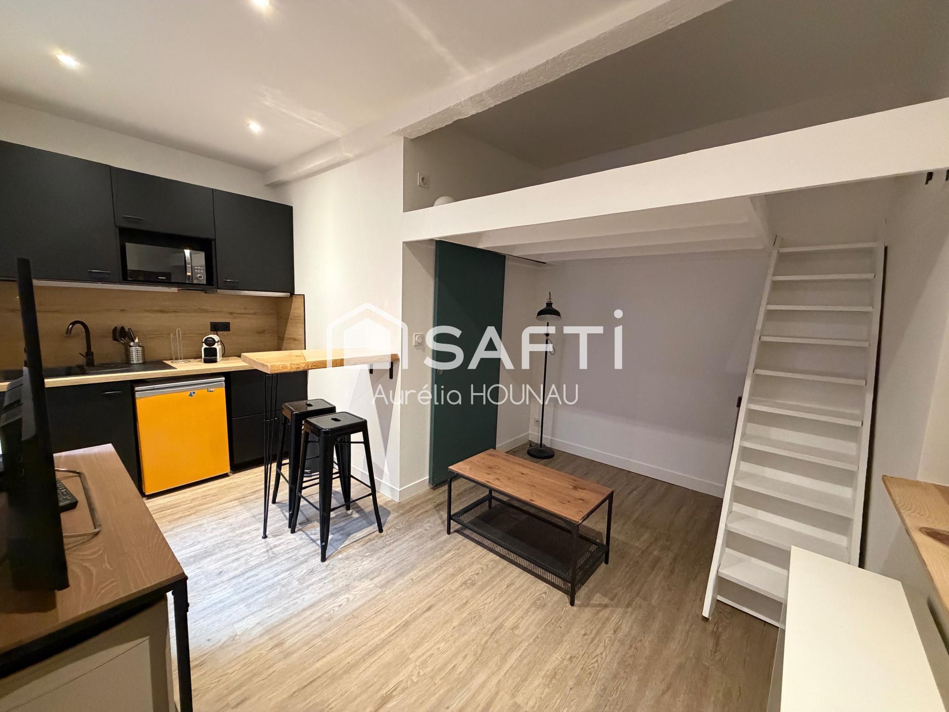 Entièrement rénové avec soin, ce bien séduit par son agencement optimisé et ses prestations soignées. Il se compose d’une cuisine équipée avec coin repas, d’une salle d’eau contemporaine avec WC, ainsi que d’un espace salon chaleureux, permettant l’installation confortable d’un canapé, d’une table basse et de rangements intégrés sous l’escalier.