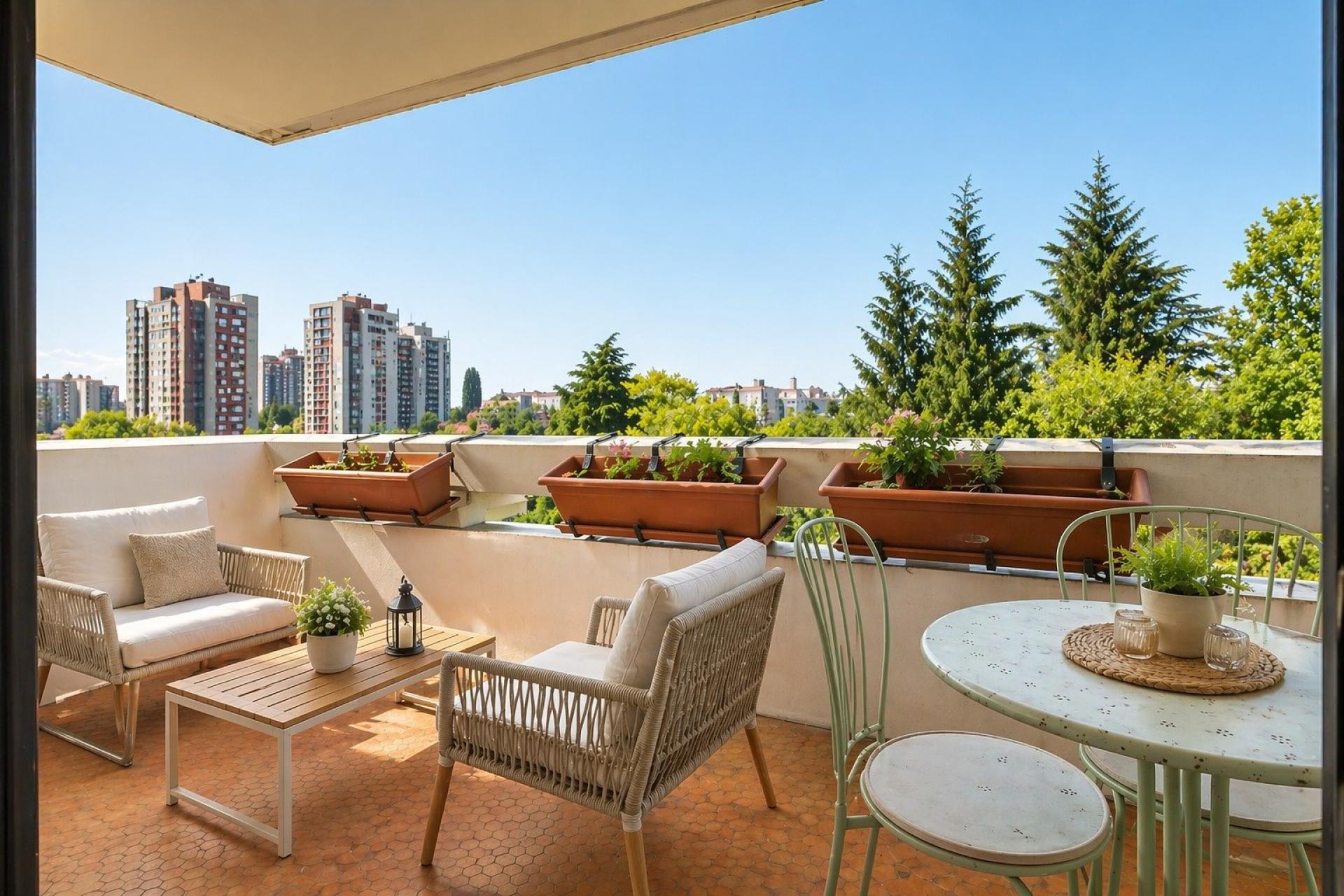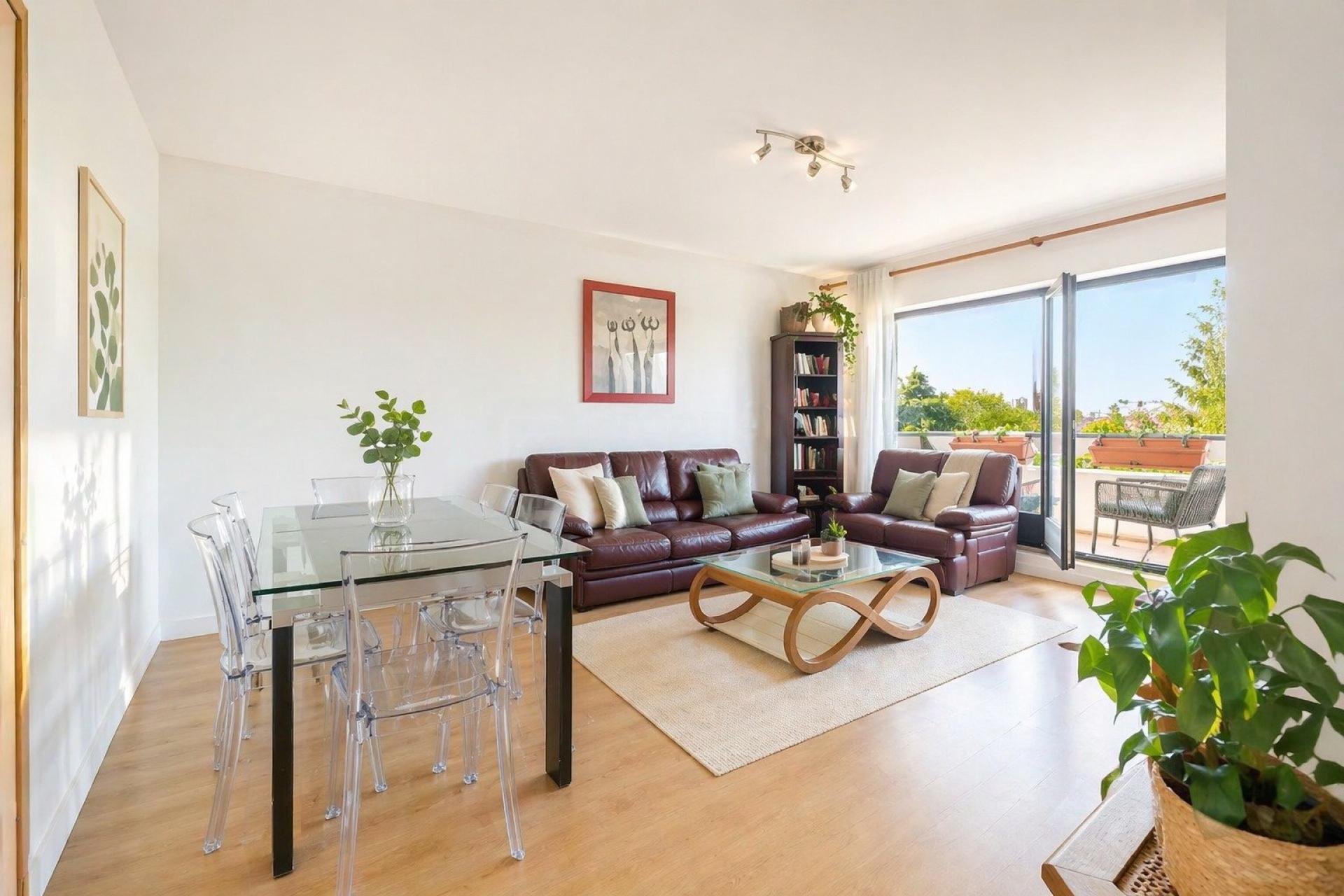 un vaste séjour lumineux ouvrant sur un balcon/terrasse d’environ 8 m²,