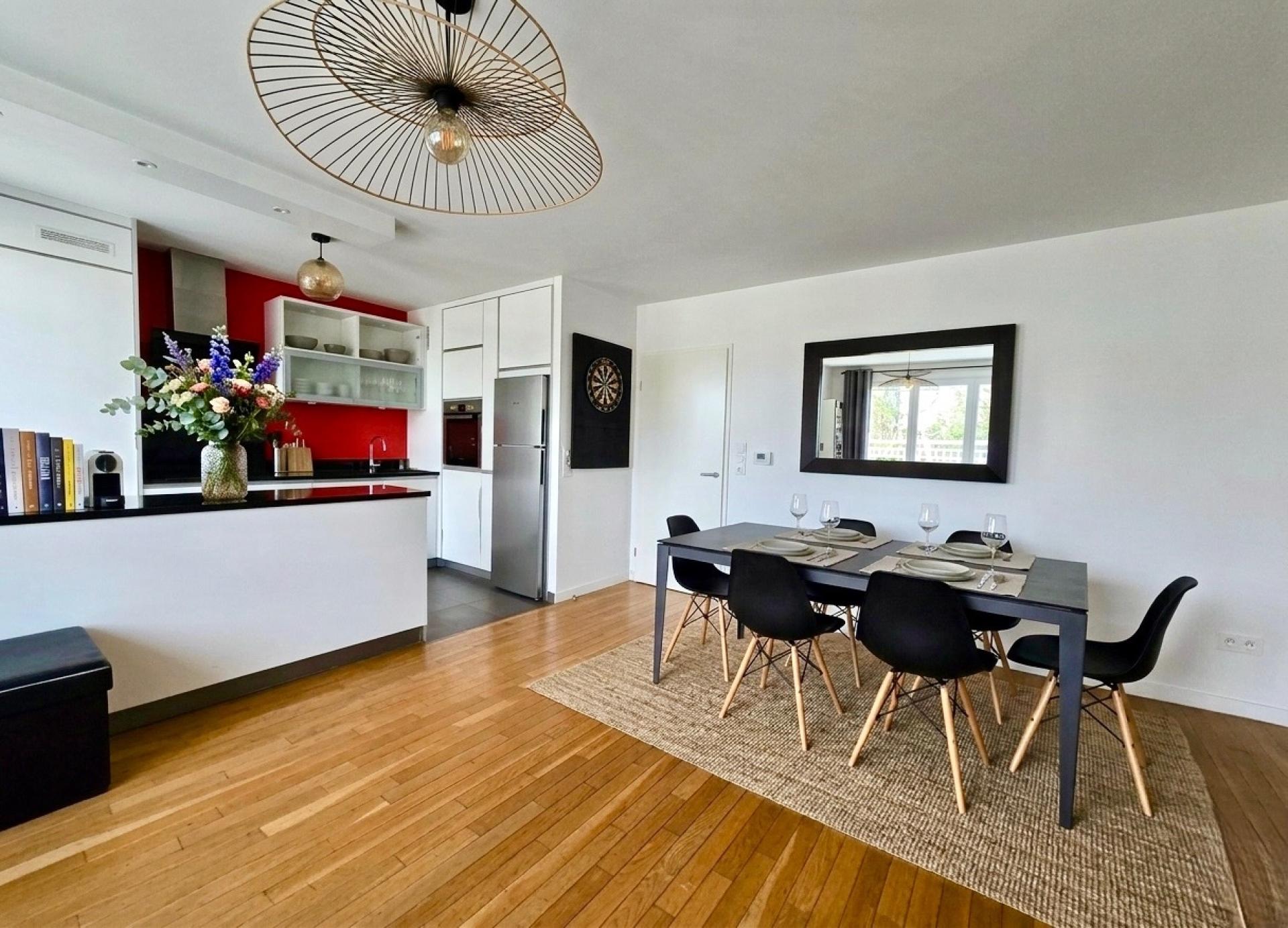 • Séjour lumineux avec cuisine ouverte équipée, créant un espace convivial et chaleureux