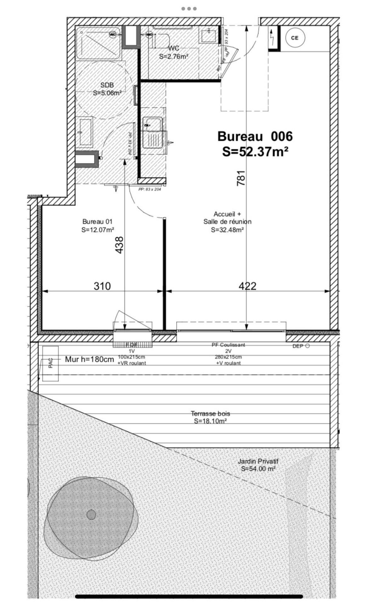 Un espace accueil salle de réunion d’environ 32 m² et un Bureau indépendant d’environ 12 m² ouvrant sur un espace extérieur privatif de 70 m².