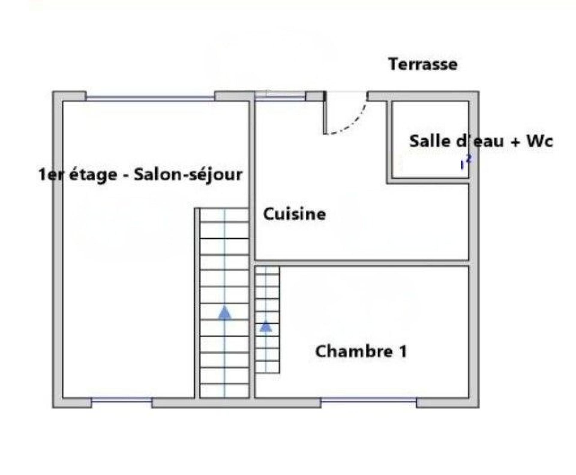 • Étage (env. 75 m²) : appartement T3 avec terrasse plein ciel de 25m², salon, chambre avec mezzanine, cuisine, salle d'eau.