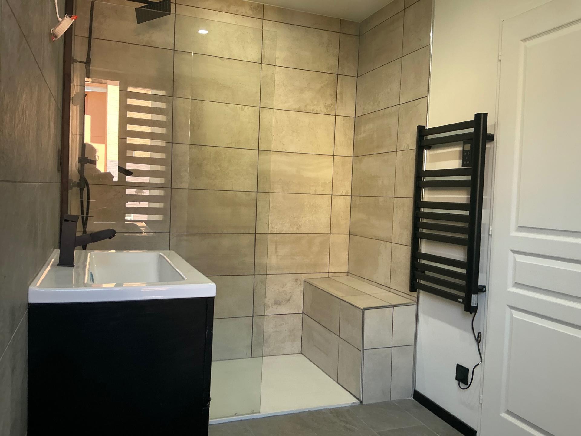 A l étage un T3 avec séjour, salle d ‘eau -wc et 2 chambres et parking privatif.