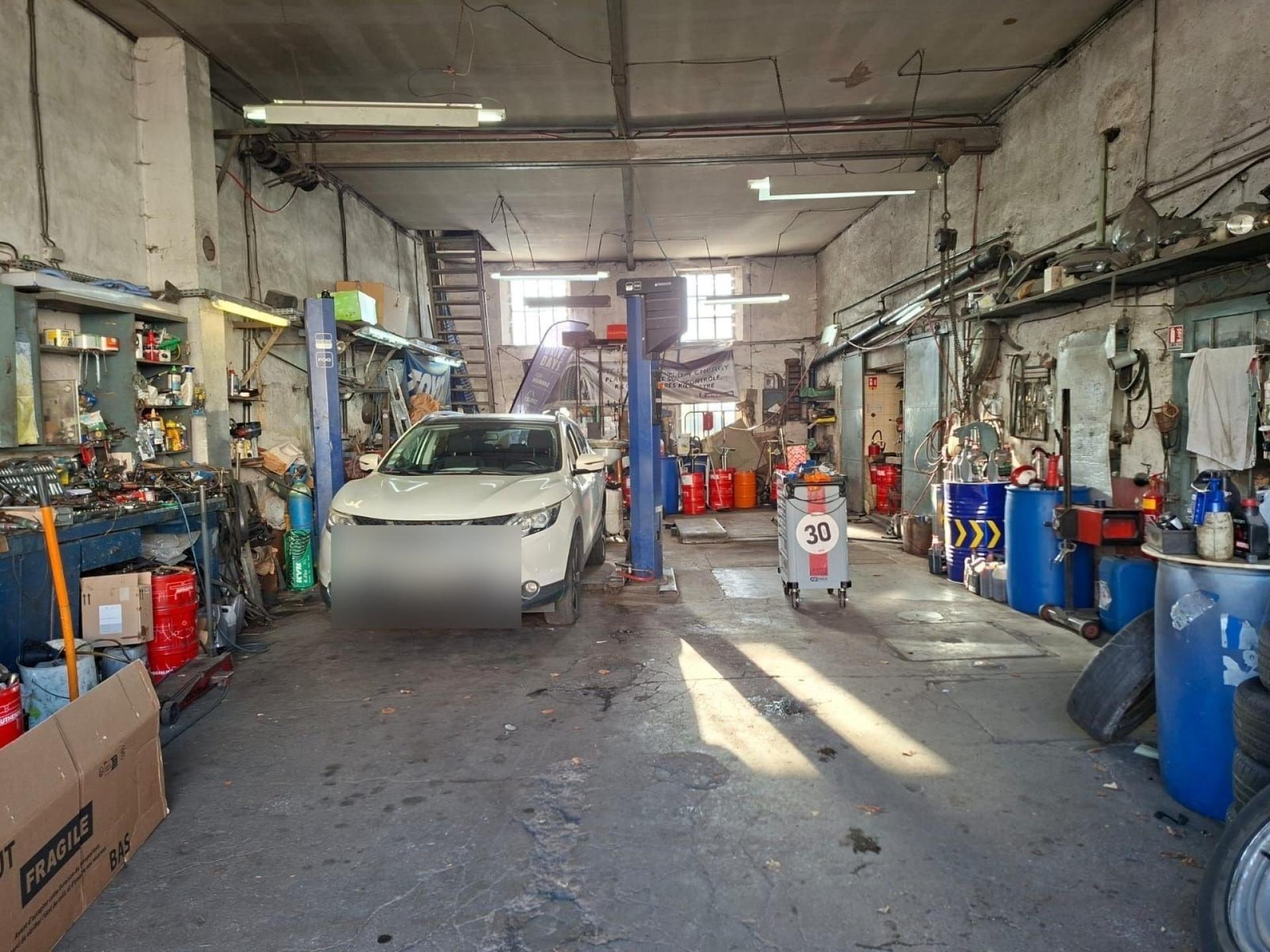 Le garage se compose d’un atelier d’environ 110m² et d’un espace de stockage de 43m², anciennement utilisé comme petite boutique avec vitrine donnant directement sur une rue passante.