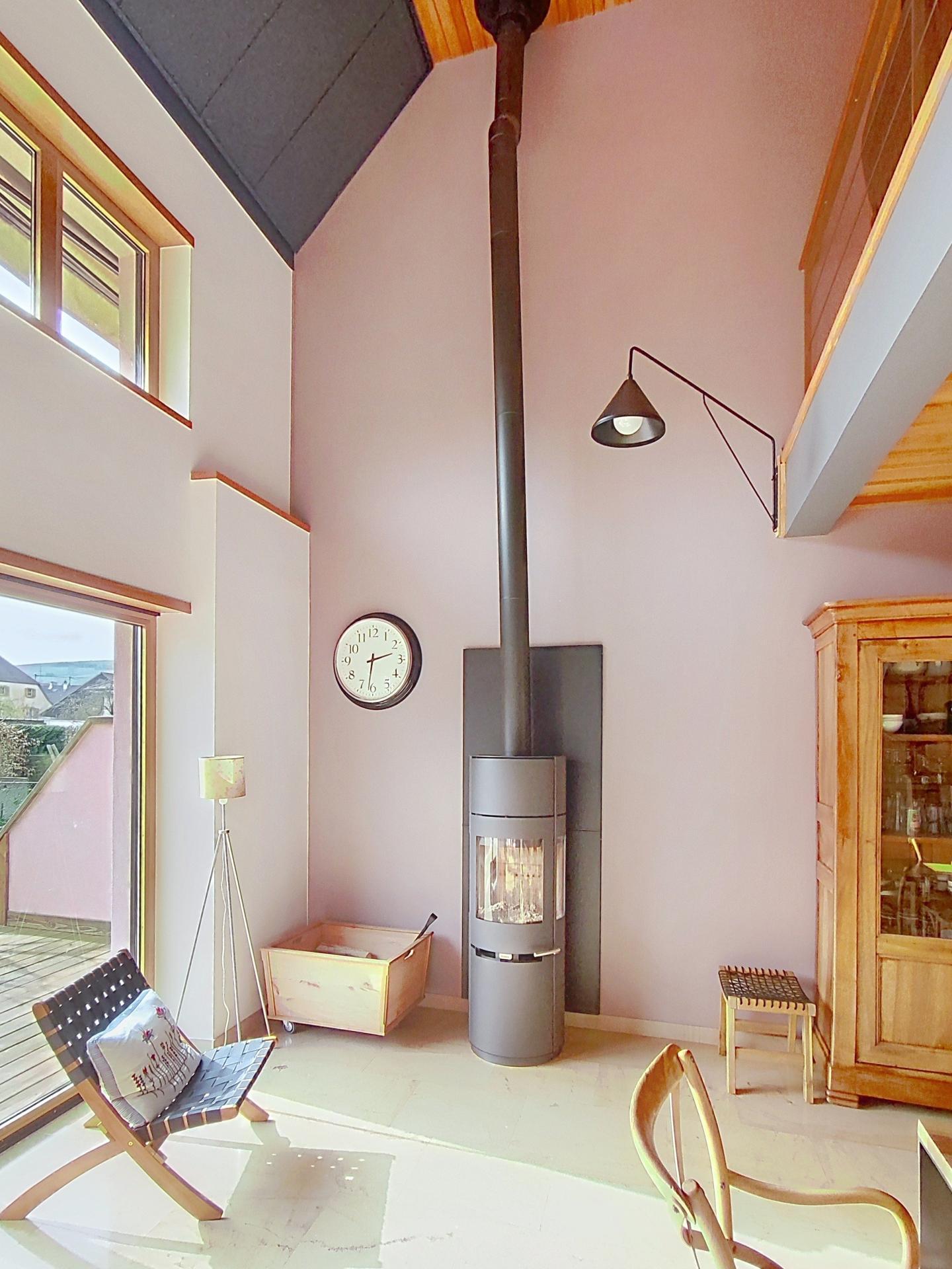 La maison est chauffée avec une pompe à chaleur (PAC) qui alimente un chauffage au sol au rez-de-chaussée et des radiateurs à l’étage. Une seconde PAC alimente le chauffe-eau. Le chauffage de la maison est complété par un poêle à bois positionné dans la pièce à vivre qui ajoute un réel confort thermique hivernal. Les ouvertures sont équipées de stores ou de volets électriques.